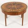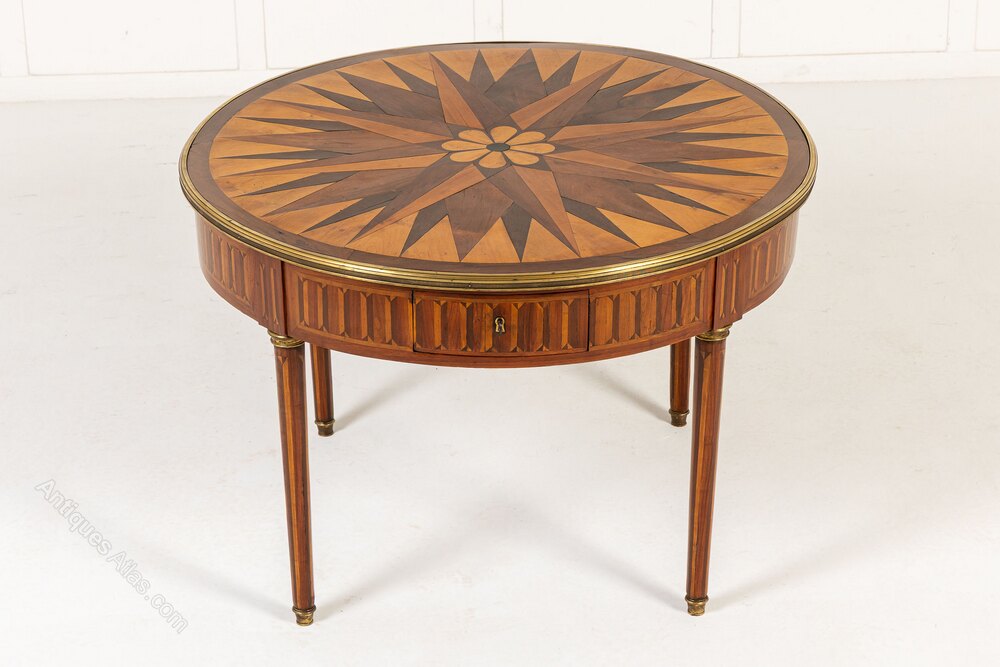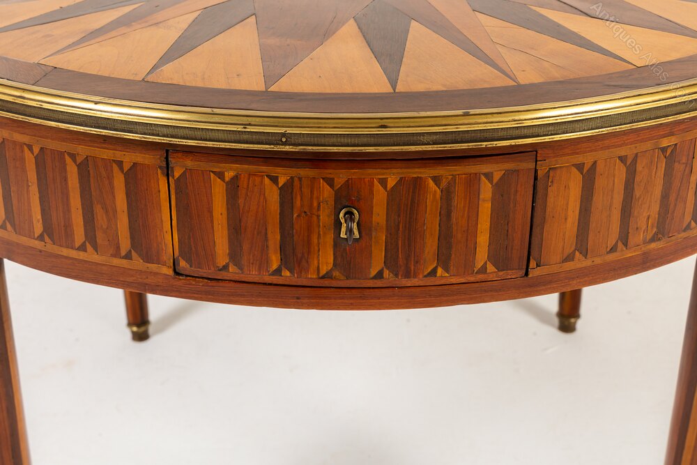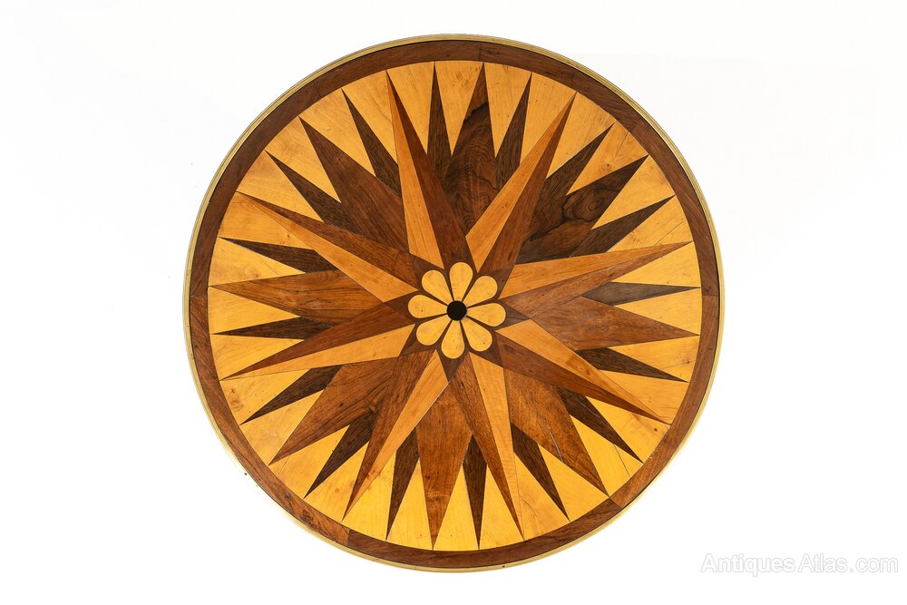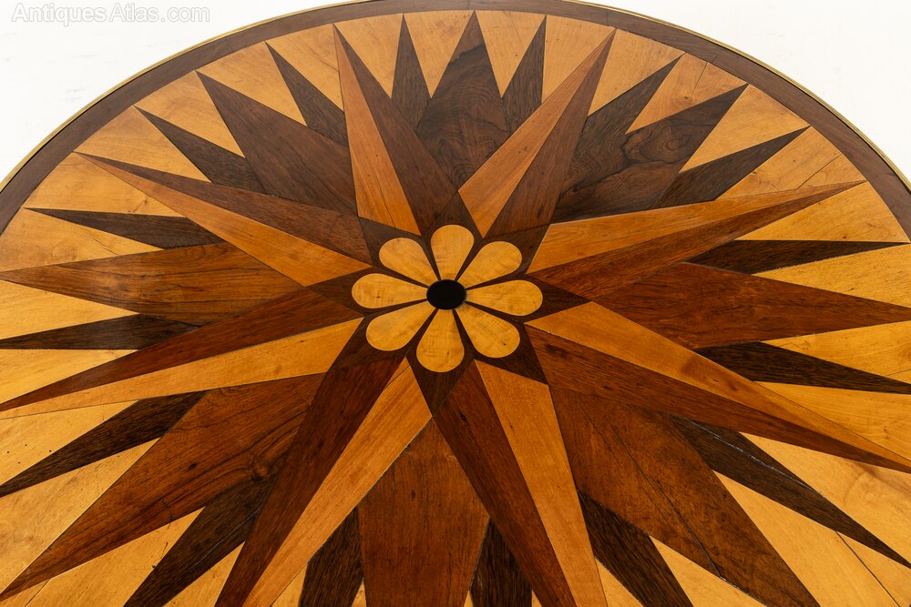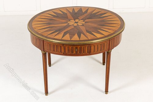 A 19th Century French Specimen Wood Centre Table.Of circular form, this table has a beautiful parquetry top banded with an ormolu edge mount. The table top is composed of various specimen woods set in to a star pattern with a flower head in the centre. The woods are arranged light against dark with additional implied texture and visual contrast. The frieze of the table continues the geometric decorative theme with a repeating motif. In the frieze are two disguised drawers. There are additional ormolu mounts to the top of each leg and the toes are gilt metal.