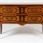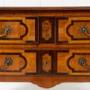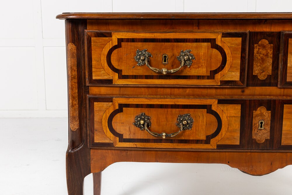 An 18th Century French Cherrywood Commode with Three Drawers.This commode is a good example of French provincial furniture in the late Louis XV and early Louis XVI taste. The legs are restrained cabriole legs of that period. The handles are of restrained rococo rather than neoclassical pattern. Veneered in cherrywood, and inlaid in contrasting satinwood and rosewood. The inlay scheme is beautiful and consistent. The top features a large inlaid panel in rosewood with contrasting bookmatched timber in the centre. This same design is then used on the drawer fronts and pilasters which are also inlaid and panalled.