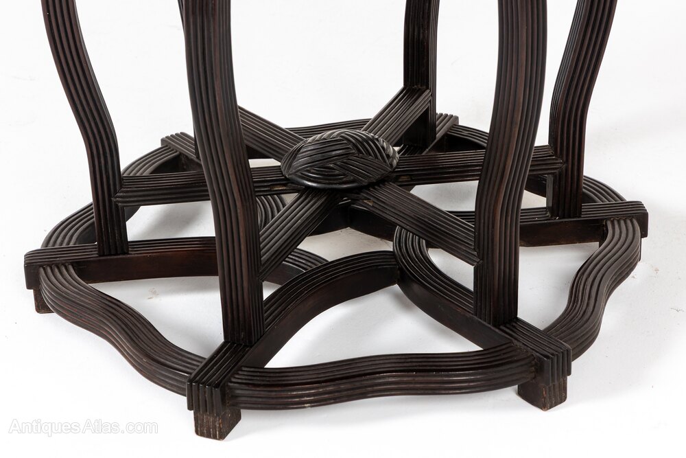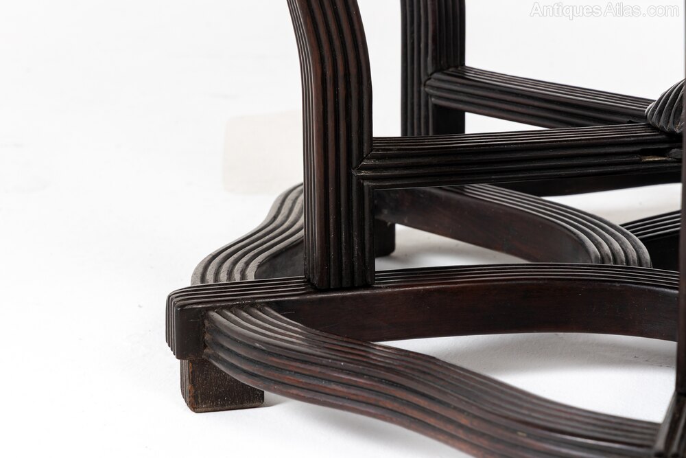 The design of the table is traditionally Chinese, the flowing form of the base probably inspired by the Lingzhi fungus, representing immortality in the Taoist tradition and frequently used as a decoration on Chinese objects. All of the wooden surfaces have reeded decoration and have acquired a good colour and patina.