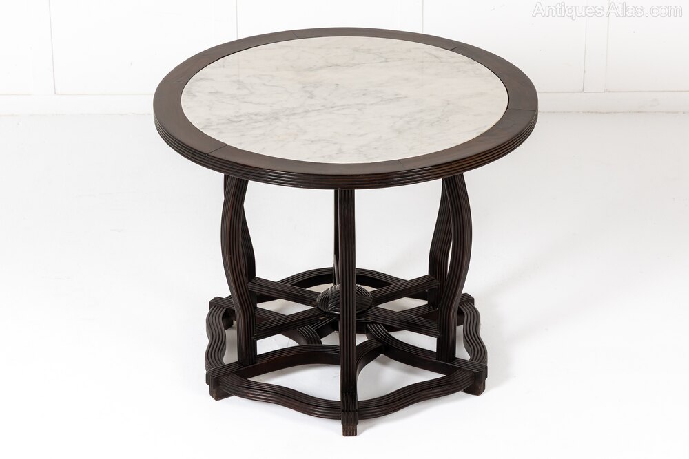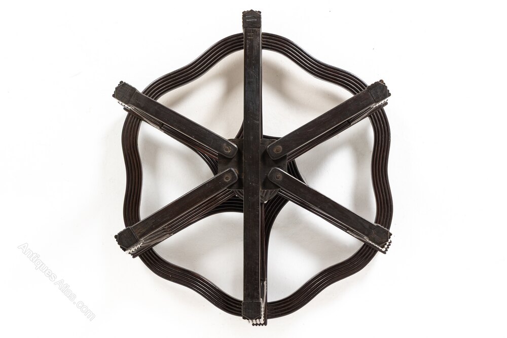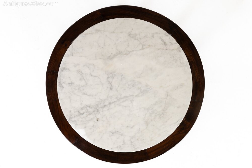 19th Century Anglo Chinese Picnic Table.This interesting table, constructed in Chinese hardwood, is of a form known as a picnic table. It separates into three sections which are joined together with the carved boss in the centre of the platform stretcher section and acts as a rivet when fully assembled. The three sections are the top, the supporting column and the base. The top has an inset marble central section.