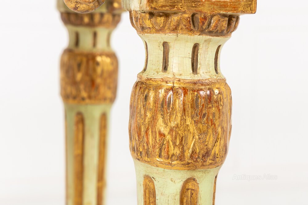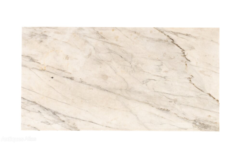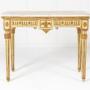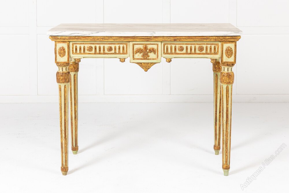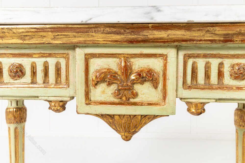 A Late 18th Century Italian Painted Console/Side Table with Marble TopThis table is rectangular shape with a fine white and grey mottled marble top. The table frame retains its original cream painted and parcel gilt decoration. Both the frieze and the legs have fluted carved decoration, highlighted with gilt, and there is a stylised fleur de lys on the central plaque in the frieze.