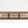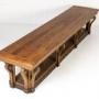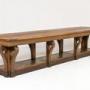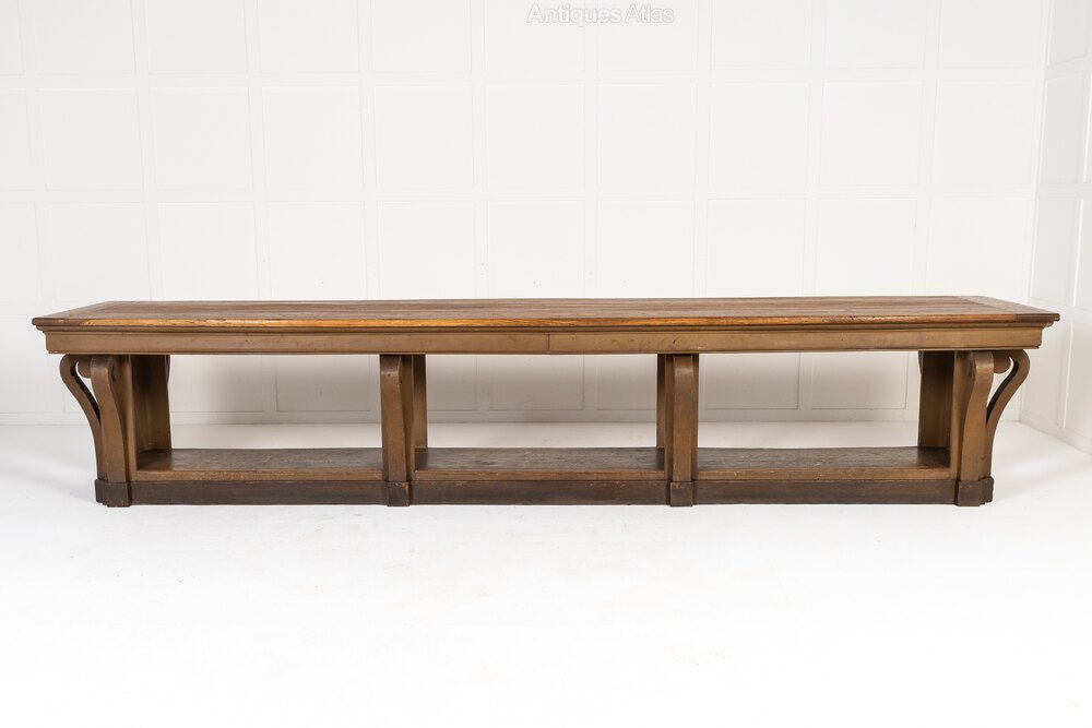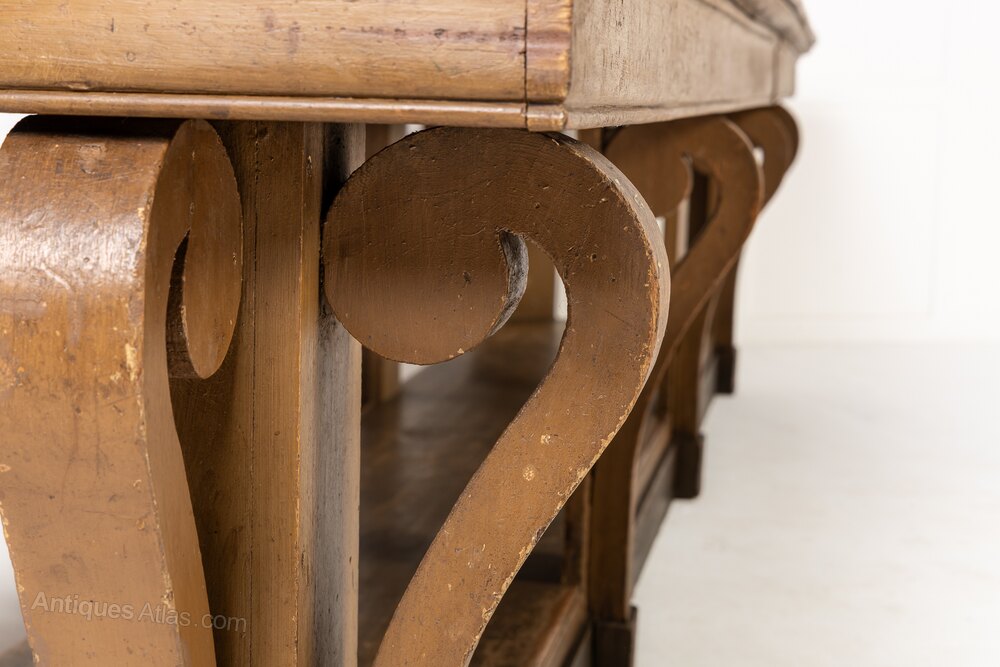 This charming and handsome table is of enormous scale, measuring four metres in length. The overhanging top is supported on a series of legs at right angles to each other with architectural corbel detailing. There is also an undertier or platform stretcher with its original paint, to which all the legs are connected. There is a plinth base made up of two layers of timber. The top is planked with cleated ends with plenty of signs of age and use which add to its charm.