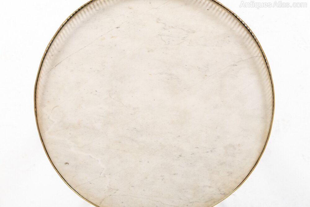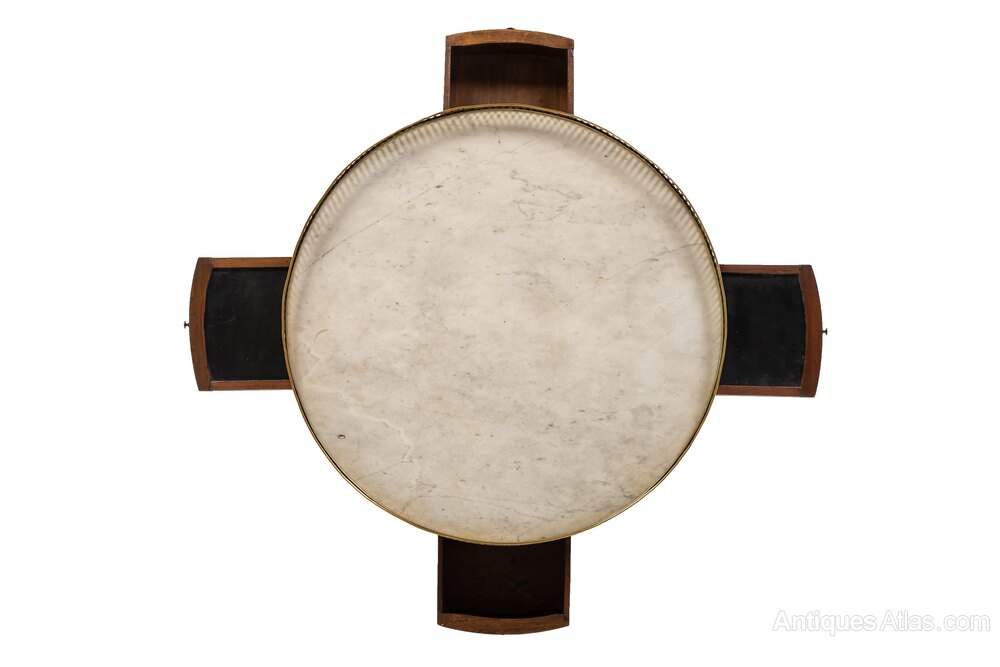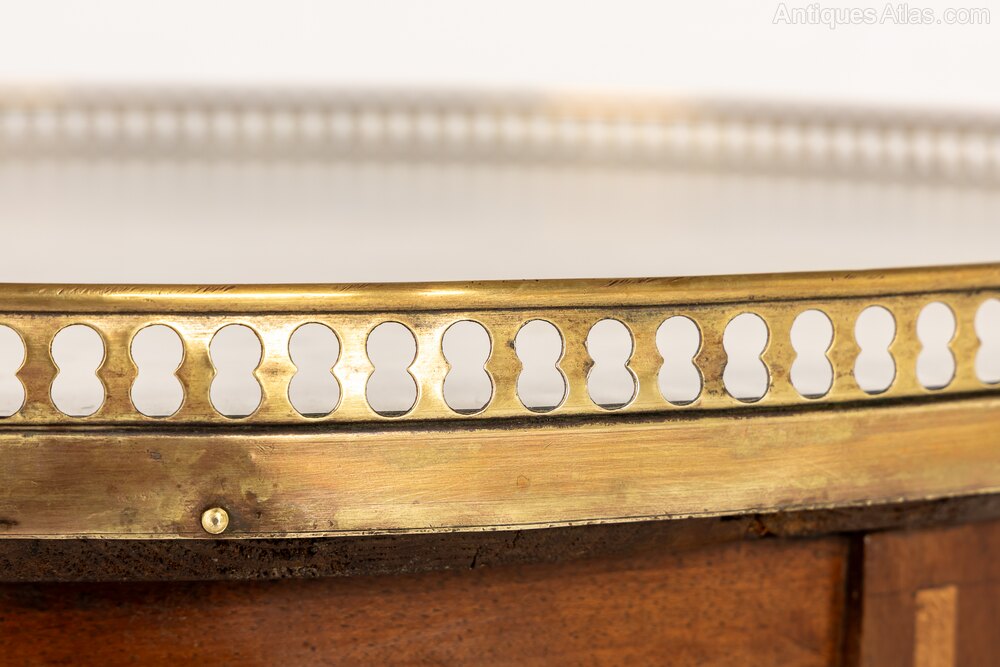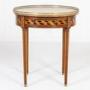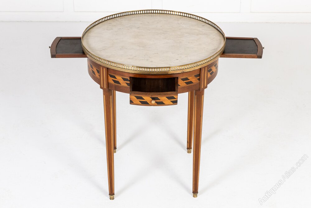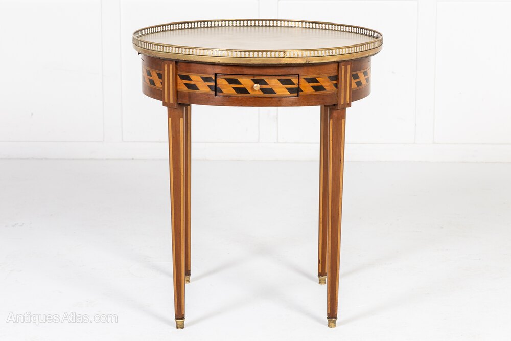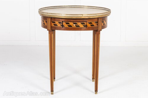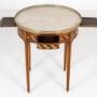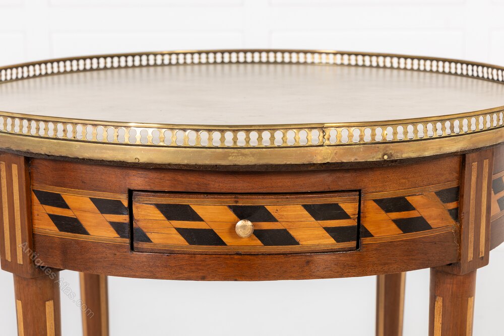 Early 19th Century French Mahogany and Satinwood GuéridonEarly 19th century French mahogany and satinwood guéridon with a marble top, edged by an attractive brass gallery. There is ebonised inlay to the frieze which has two small drawers and two pull out slides with leather inserts. Standing on tapering legs with small brass feet.