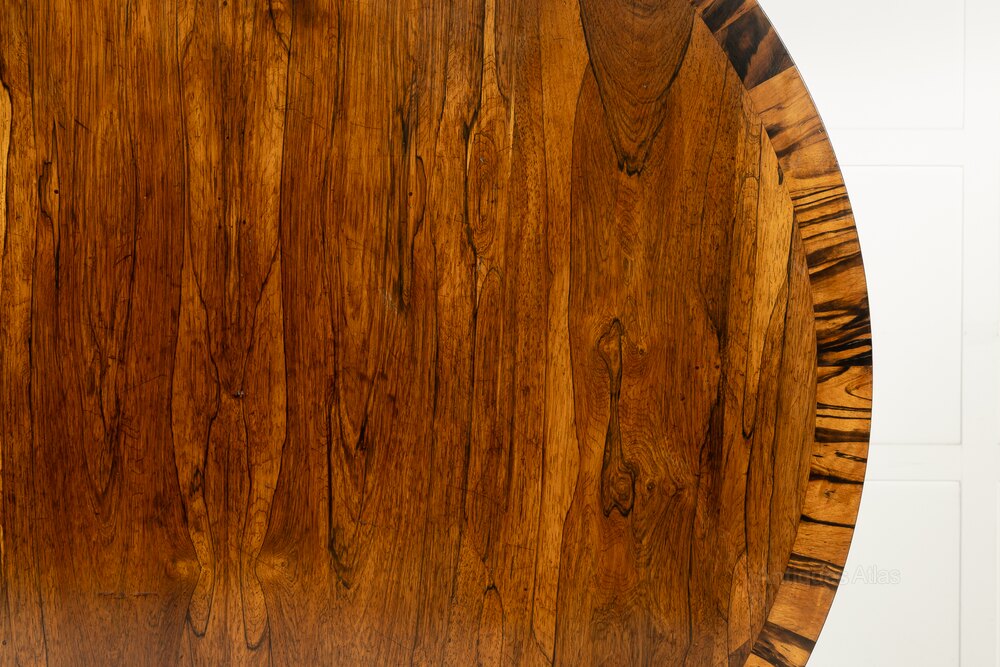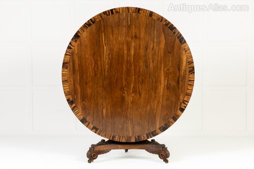This circular centre table has a tilt top mechanism allowing it to stand at the side of a room when not in use. The top is veneered in beautifully figured bookmatched rosewood and it has finely carved winged scroll feet and conforming trusses above on the base, surrounded by gadrooning. The top of the table is widely crossbanded in coromandel.