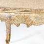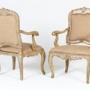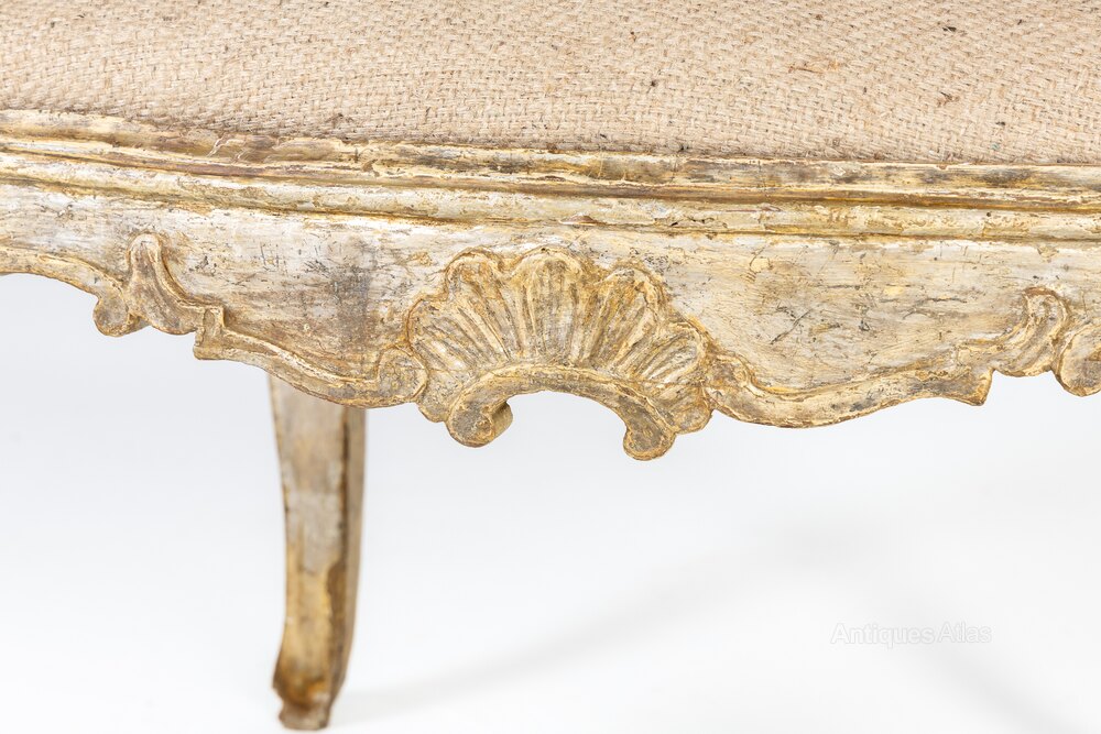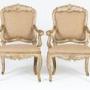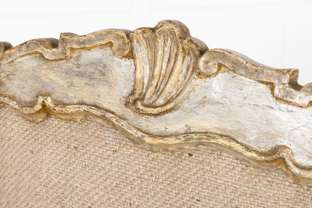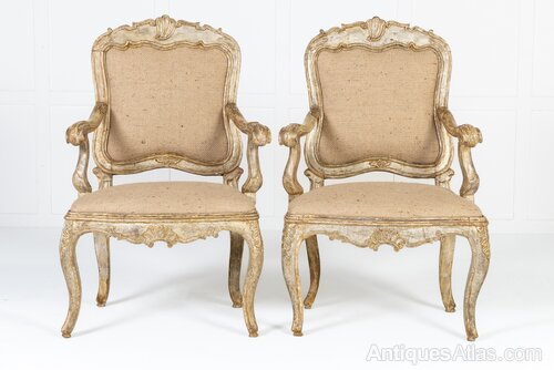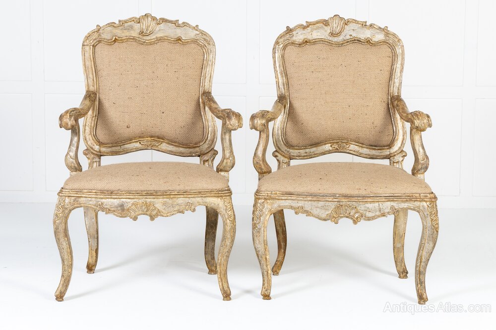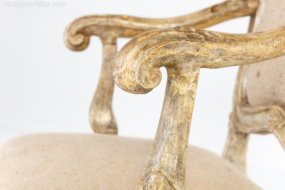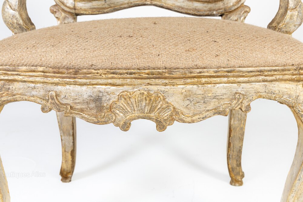 These grand armchairs, of large scale, retain their original silvered and gilt finish, a speciality of Italian makers during this period. The decoration of the chairs is in the restrained rococo manner with cabriole legs, carved shell detailing and hints of asymmetry on the crestings. The arm supports have scrolled ends and the chairs stand beautifully.