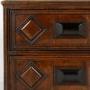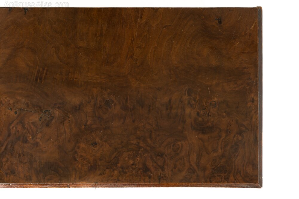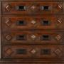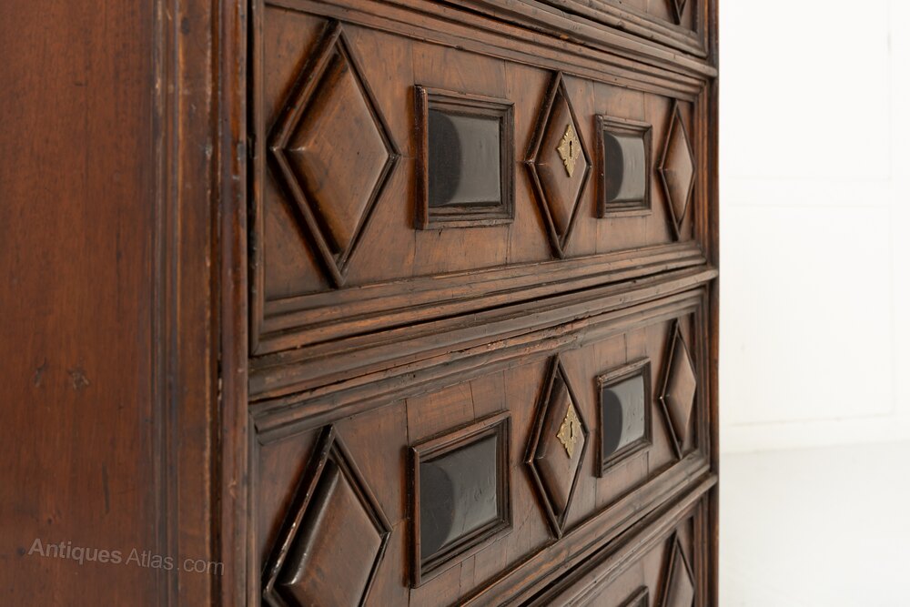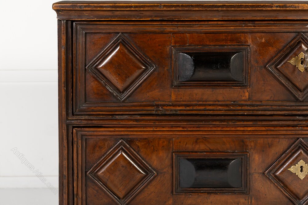 The chest with four equally sized drawers, all with raised diamond shaped and ebonised rectangular bosses. There is a key and the escutcheon plates to the central bosses are brass. Each drawer has a cockbeaded edge and other mouldings. The sides of the chest have straighter grained walnut but the top is veneered in burl walnut of lovely colour and patina.