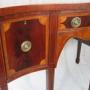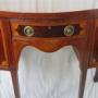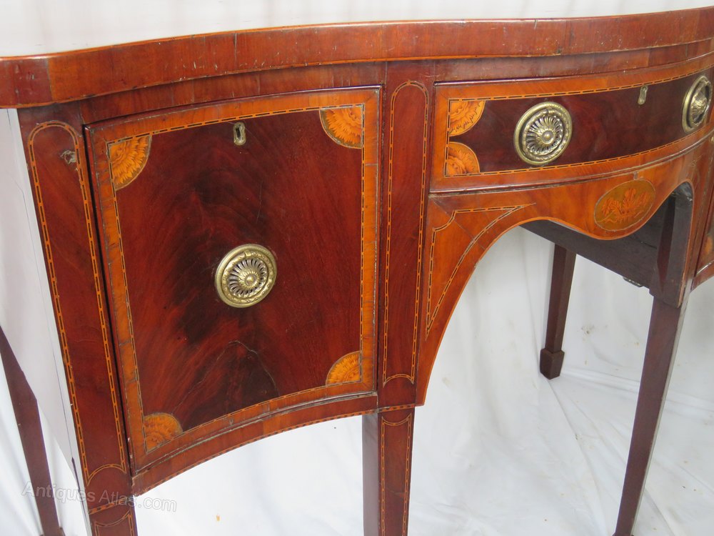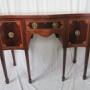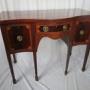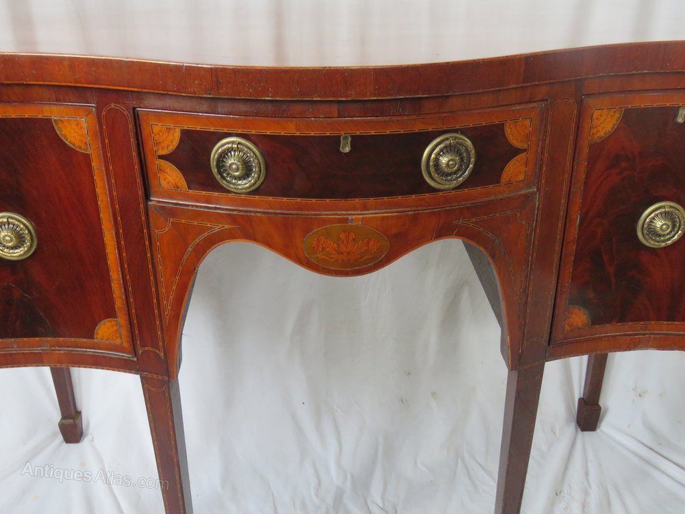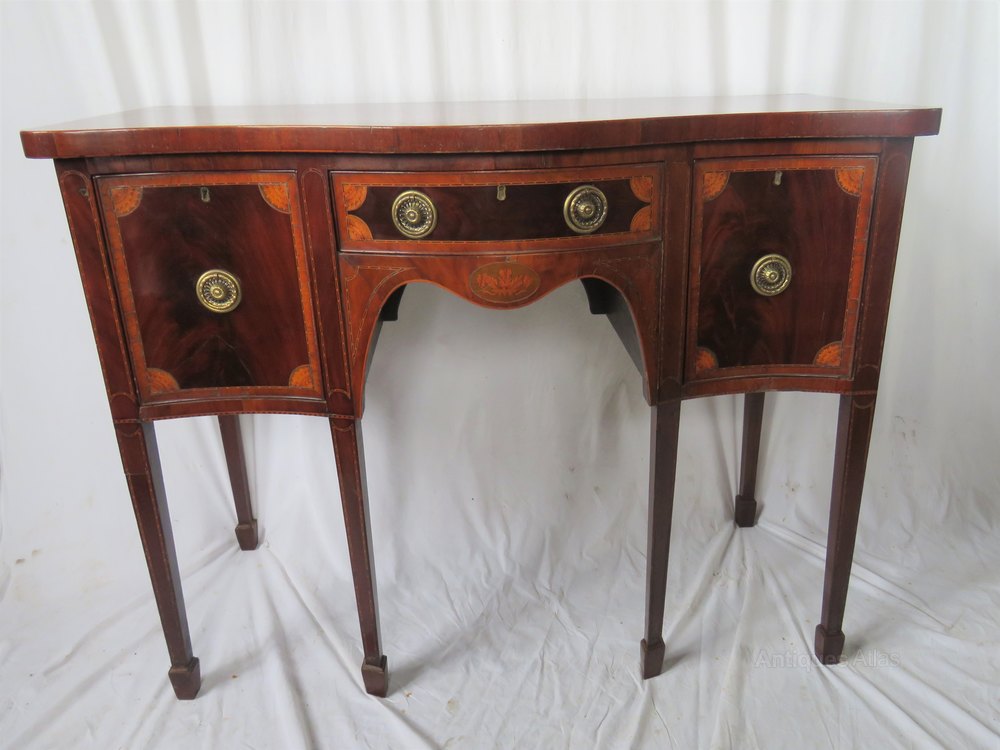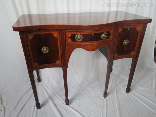 A very pretty Geo.III period Mahogany sideboard profusely decorated with inlay. The serpentine top has refined string inlay on the front and sides, while the front of the sideboard is inlaid with the half shell motifs so popular during the Georgian period.The sideboard stands on 6 legs with spade feet. It has a central drawer with deep drawers to each side. The handles, like most pieces of this age, are not original and the sideboard shows the signs of use, consistent with its age. The colour is rich and, what one would hope for in a period piece of furniture. It has served many generations and will serve many more.