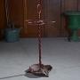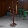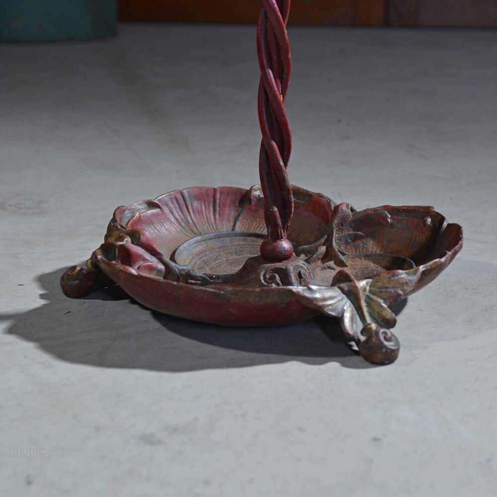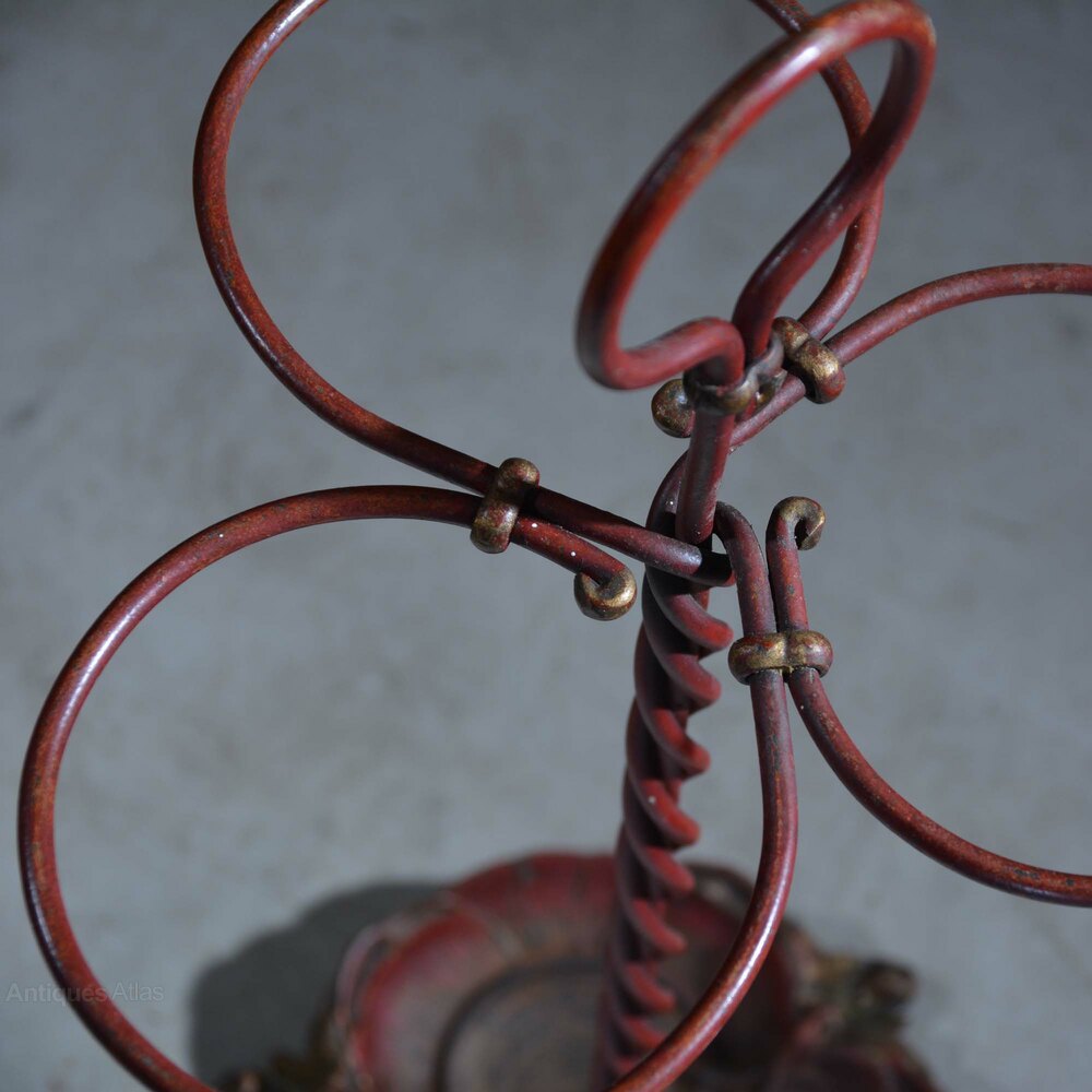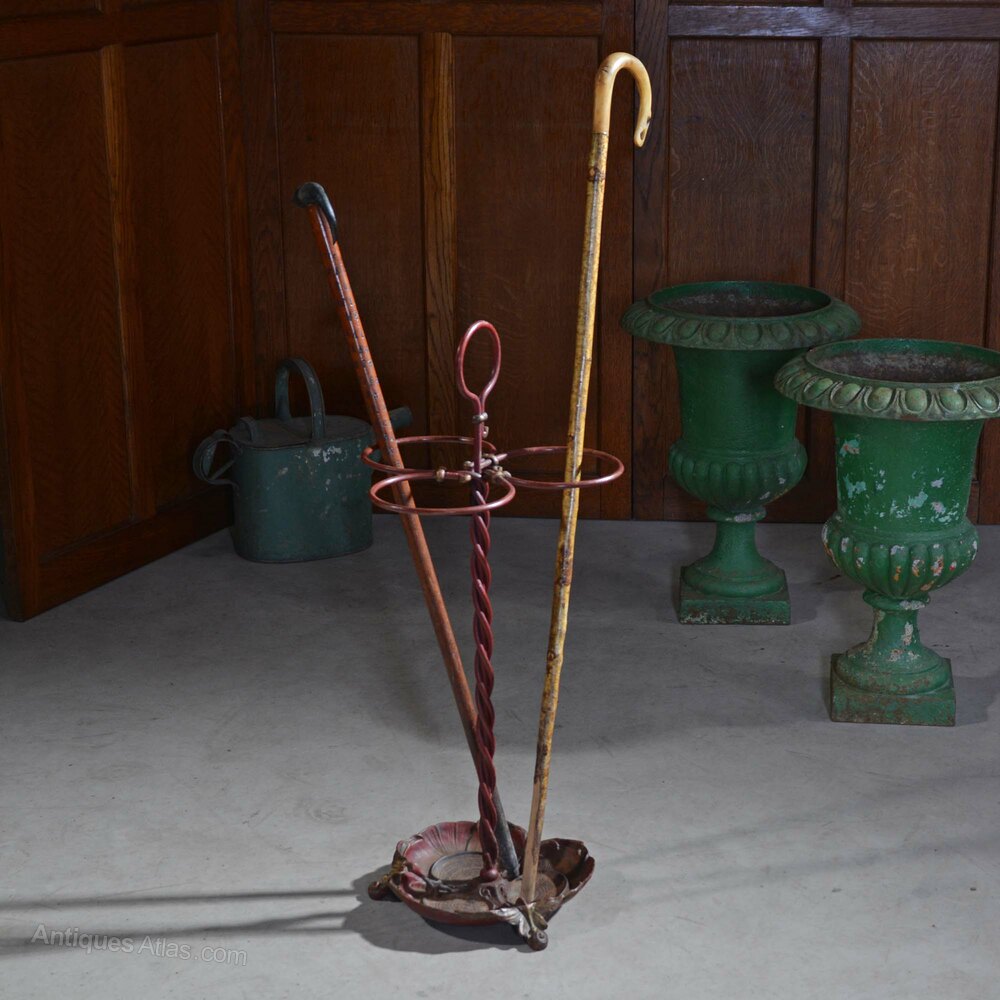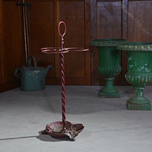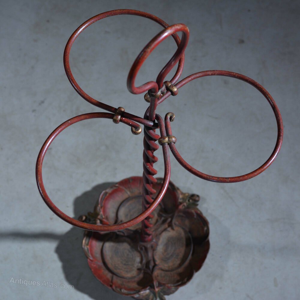 19th Century Umbrella StandCast iron painted polychrome base of floral tripartite form, wrought iron barley sugar stem supporting a trio of circular rings with a ring handle above. Of lovely design and constriction, the base very well cast in original rubbed paint, the stem consists of the central wrought iron bar around which the three further bars are uniformly wrapped to terminate in the umbrella rings.