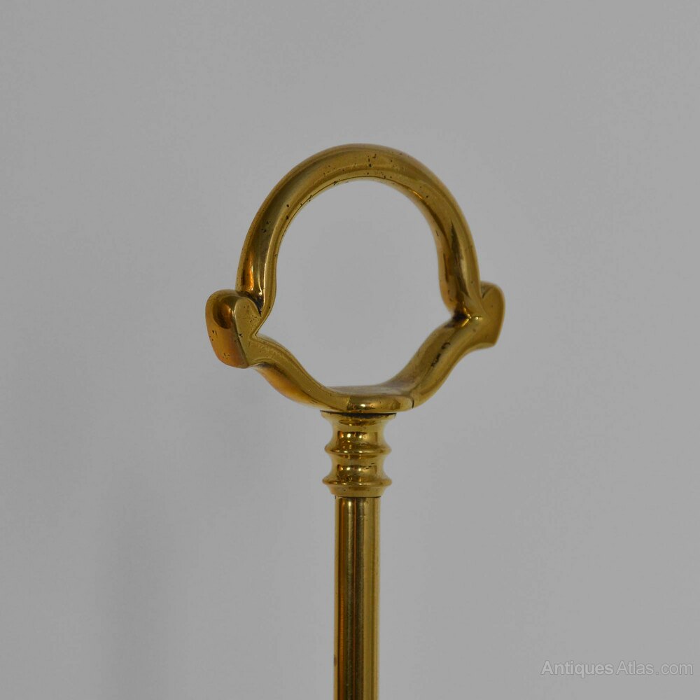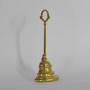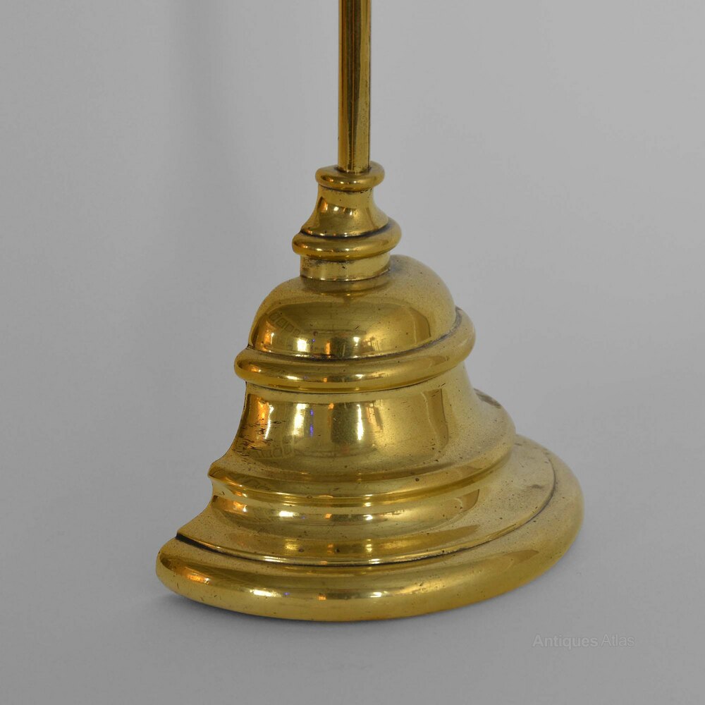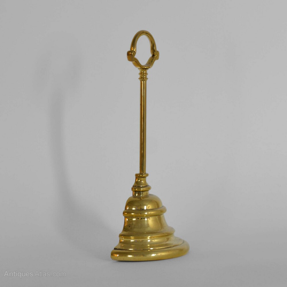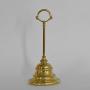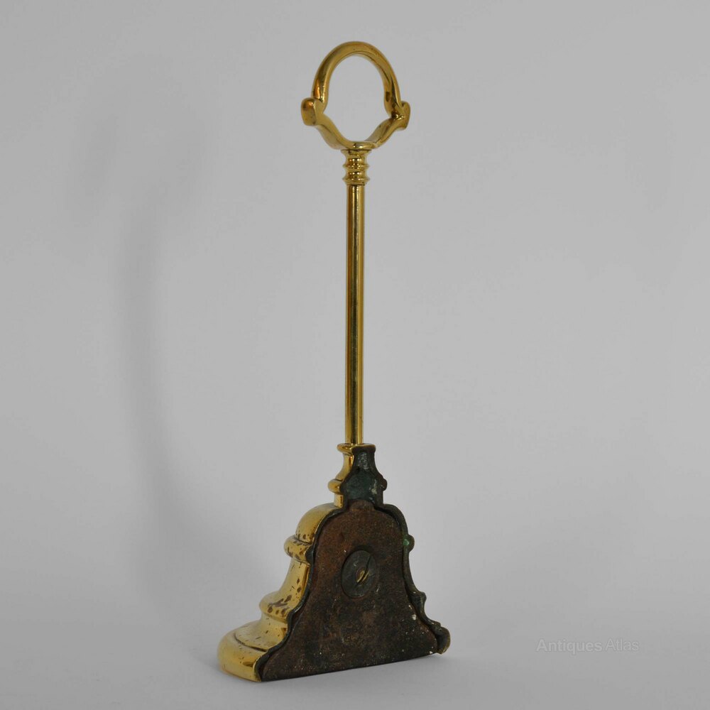 Victorian cast brass doorstopStepped demi-lune bell shaped base to column with ring carrying handle.