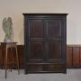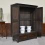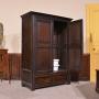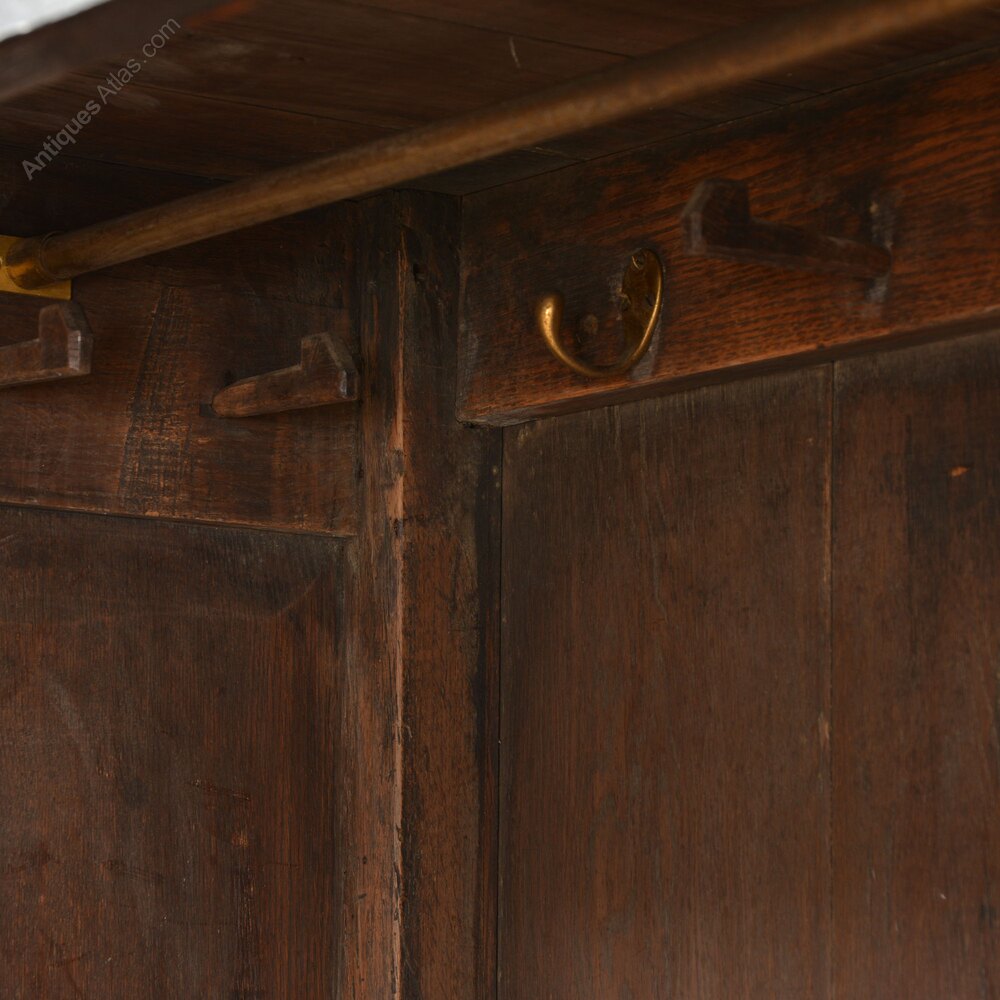 17th century panelled oak livery cupboardMoulded cornice over a pair of raised fielded panel doors opening on pairs of wrought iron H hinges to a void hanging space, with original wooden peg hooks and later brass hooks and hanging rail, over a pair of moulded front drawers.