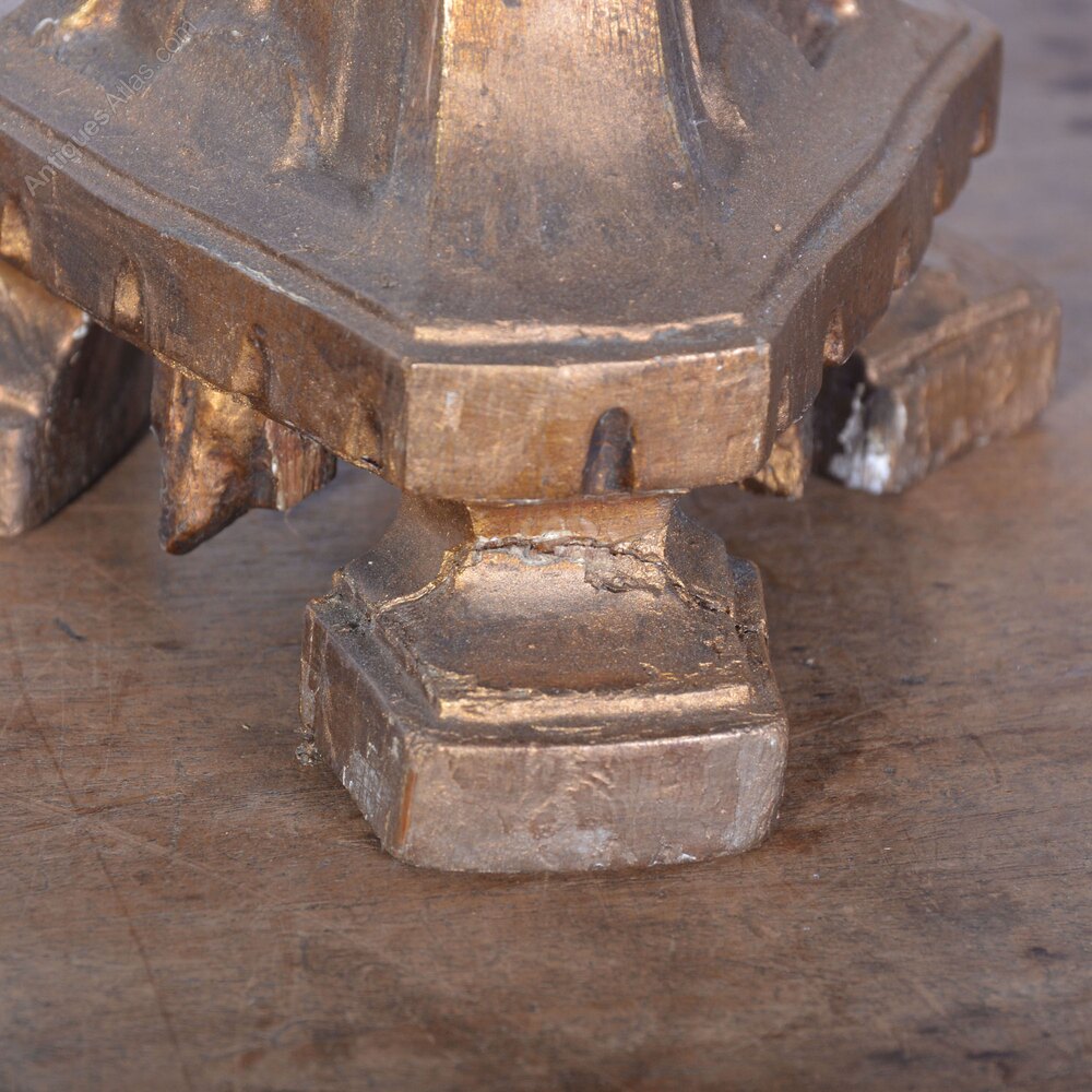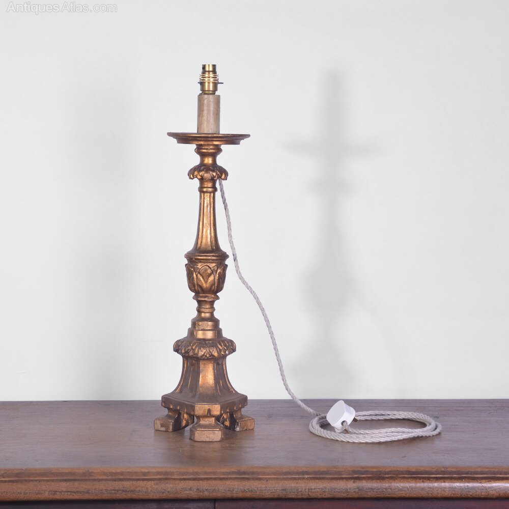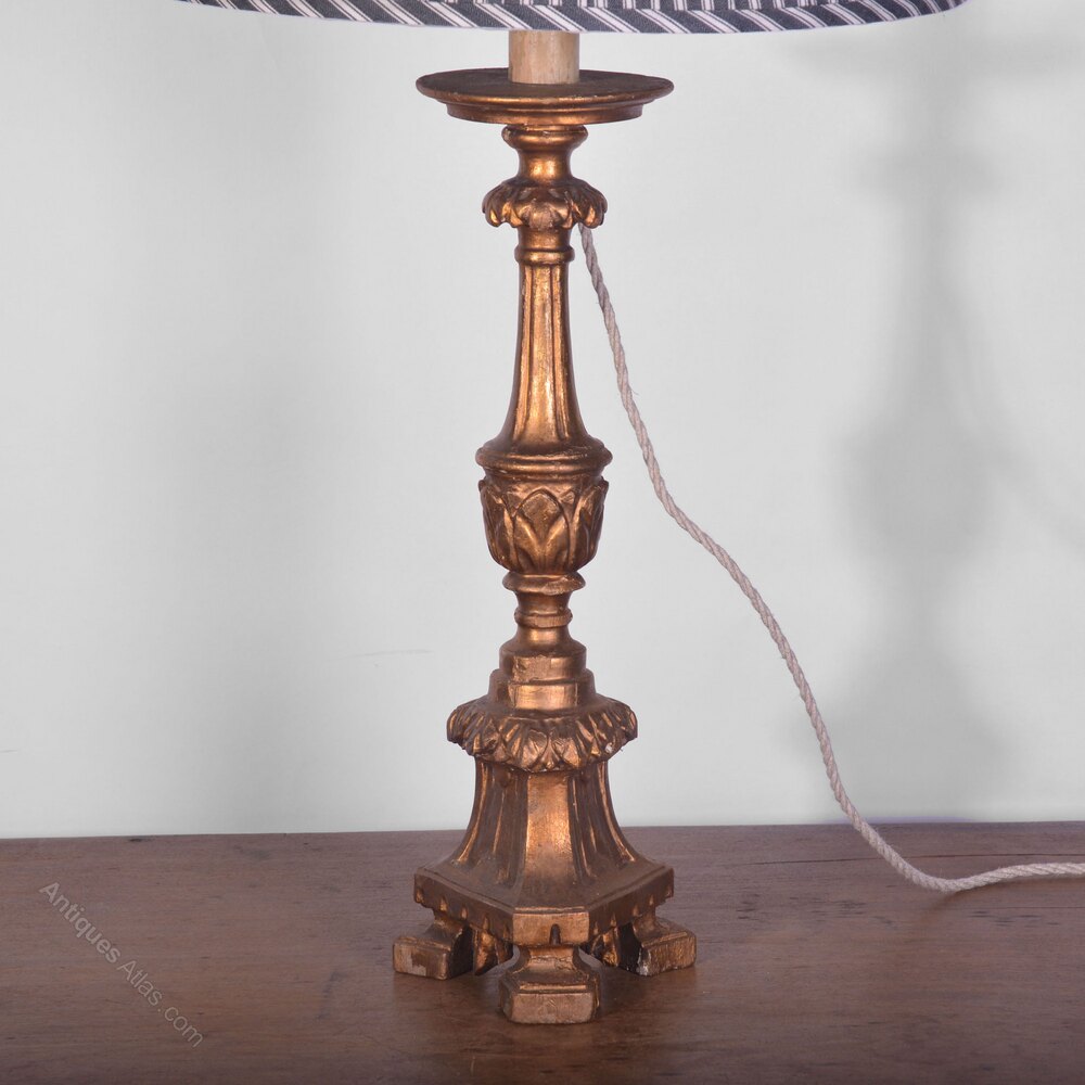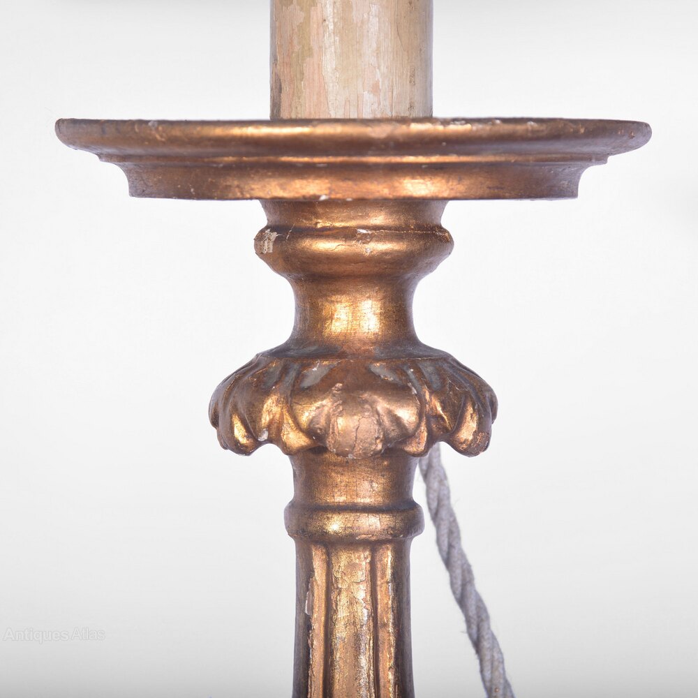 19th century continental carved giltwood lampBaulster column standing on a tripod base. Wired with three core braided natural linen flex, bayonet cap bulb holder and PAT tested.
