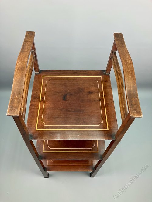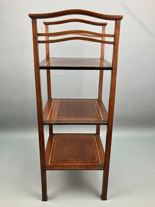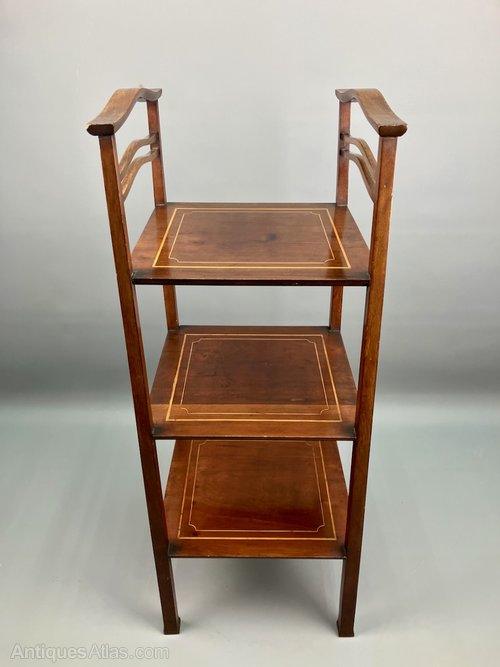 A wonderful Liberty & Co Arts & Crafts 3 tier mahogany cake stand or Etagere, dating to circa 1910, each level with satinwood inlay. Illustrated in a Liberty Catalogue of the time, as can be seen in Daryl Bennett's Liberty Furniture book. Equally useful as its original stated purpose of a cake stand or as a 3 tier etagere or display stand it is an elegant design. I love the shaped handles and corresponding wavy stretchers, and the slender flared supports with slightly shaped foot. Offered in good condition, commensurate with age, it measures 82cm tall, and 31.5cm max square. The price includes delivery within 30 miles of Taunton. Elsewhere likely £84.00 England and Wales and £96.00 lower Scotland.Shipping information