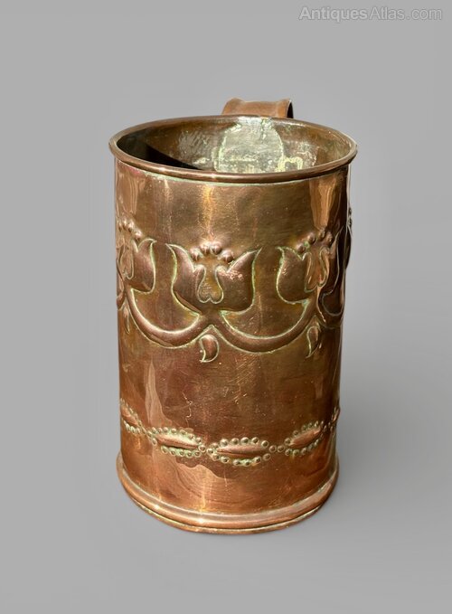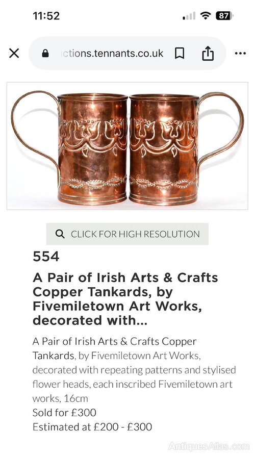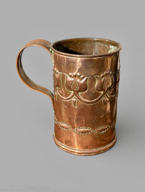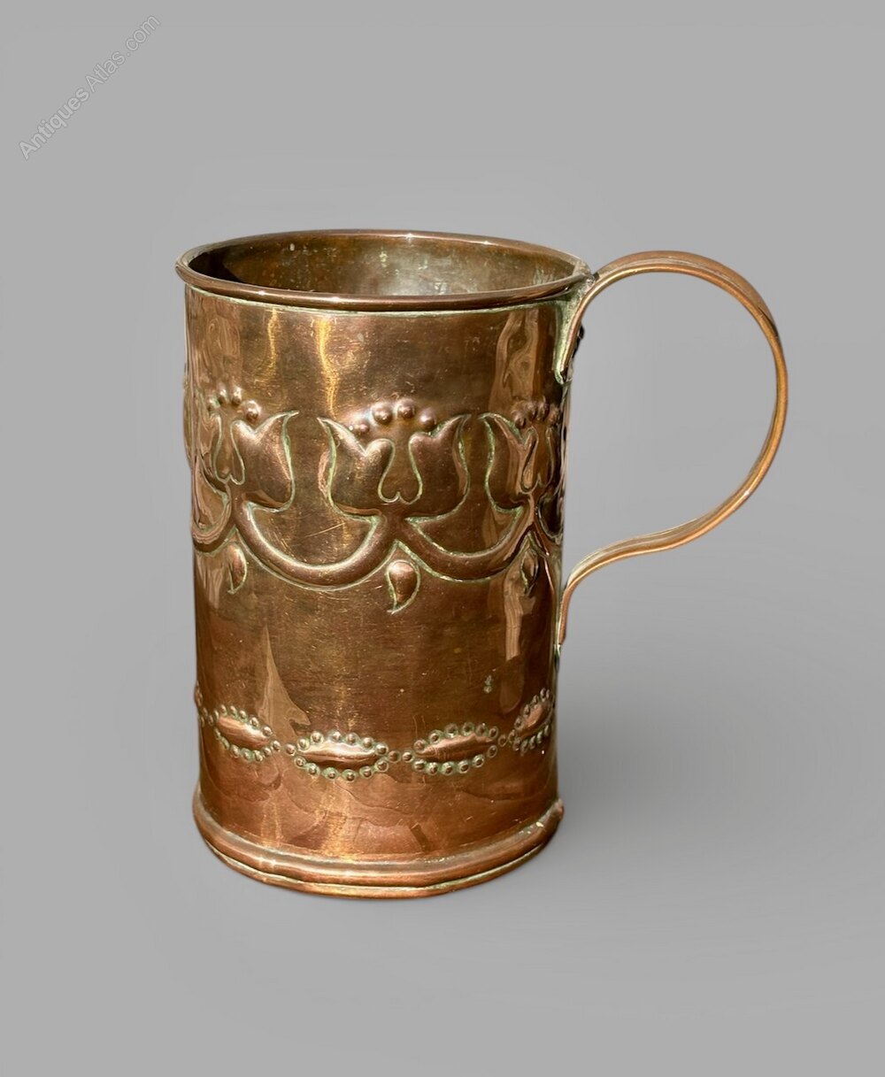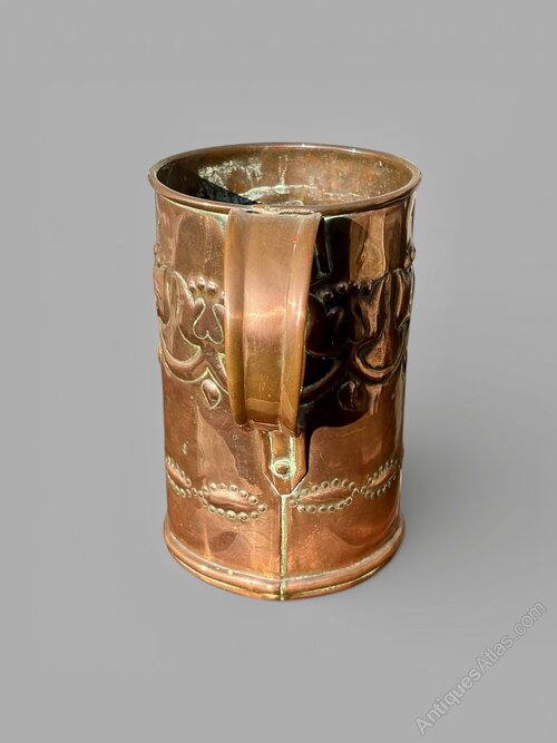 A great Irish Arts and Crafts copper tankard, made at Fivemiletown Class in County Tyrone. Dating to circa 1900-1910, the design identical the stamped pair sold at Tennants Auctioneers on 15th July 2017, as illustrated in the last photo. Most likely designed by John or Mary Williams it is a lovely design and very well executed on this example. The School sold items through Liberty and Co, amongst other places, and this is possibly a reason why so many pieces aren't marked. It measures 17cm tall, with a diameter of 11.5cm to the body and a max width of 17cm including the handle. Offered in good condition, commensurate with age, there is a solder to the inside of the body behind the handle but not noticeable from the exterior. The price includes UK postage.Shipping information