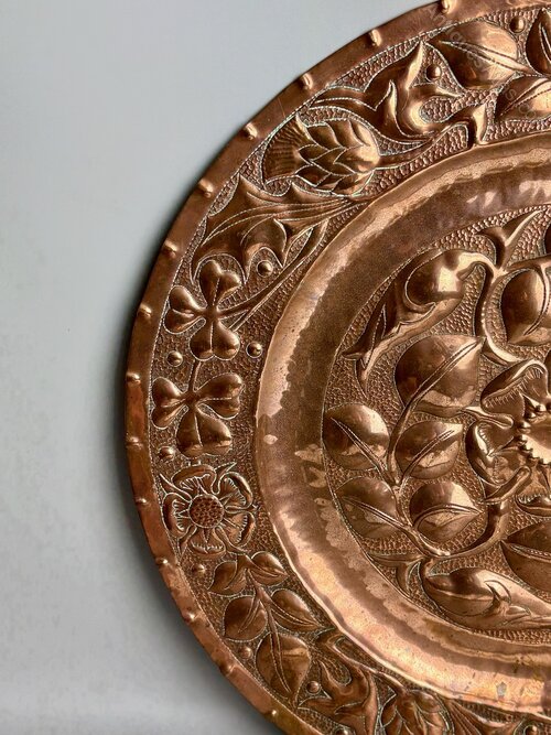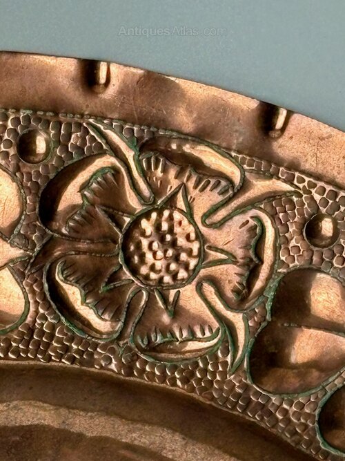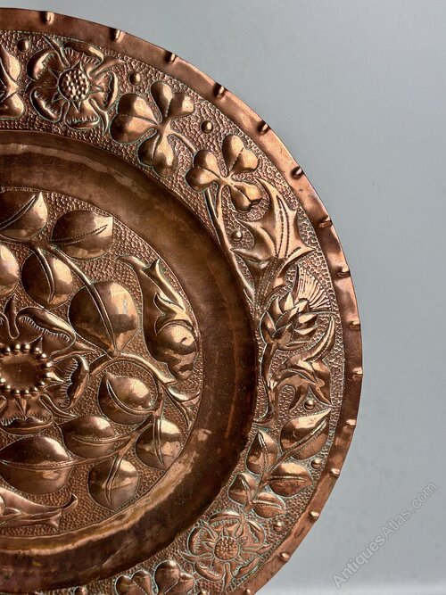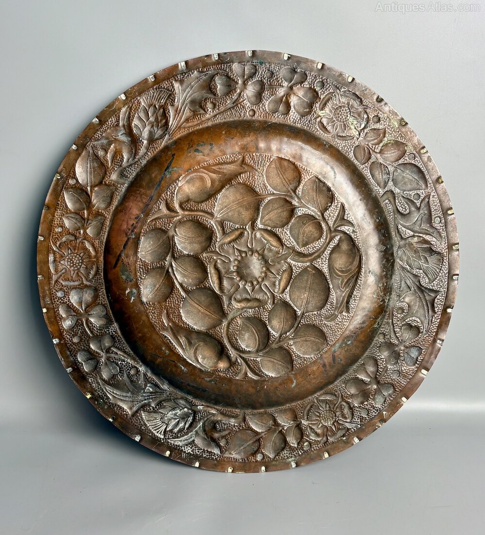 A great Arts & Crafts copper charger, dating to circa 1900, unmarked but almost certainly made at the Newton Class in Cambridgeshire. The central section is decorated with entwined flowers surrounding an England rose, whilst the border includes roses for England, thistles for Scotland and shamrocks for Ireland. Worked on a heavy gauge of copper this is a great piece and is in good condition, commensurate with age, with crisp detail and only minor markings. Measuring 41cm or 16 inches in diameter it is a substantial size. The price includes UK postage.Shipping information