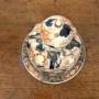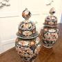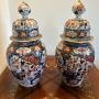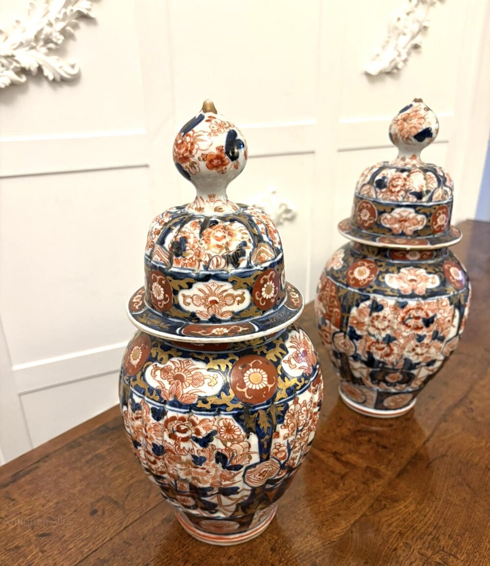 A striking and decorative pair of Japanese Imari lidded vases finely hand-painted in the traditional Imari palette of rich cobalt blue, iron red and vibrant gilding. These baluster-shaped vases display exceptional symmetry as a pair, with well-matched proportions, colour balance and decorative detailing.Each vase is decorated with dense panels of stylised chrysanthemums, peonies and scrolling foliage, framed by bold red cartouches and enhanced throughout with fine gilt embellishment. The domed lids are equally detailed, topped with elegant onion-shaped finials making the pair particularly impressive in both height and presence.