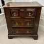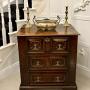 A superb late 17th-century antique Jacobean oak chest of drawers fabulously crafted and full of period character. The chest features a striking geometric moulded front—a hallmark of Jacobean design—with two short drawers above two long drawers each fitted with original handles and escutcheons.The drawers are oak-lined with early dovetail joinery and run smoothly within the carcass which stands on solid bracket feet. The top displays an exceptional patina, showing the deep, lustrous tones and natural wear that only centuries of use can produce.