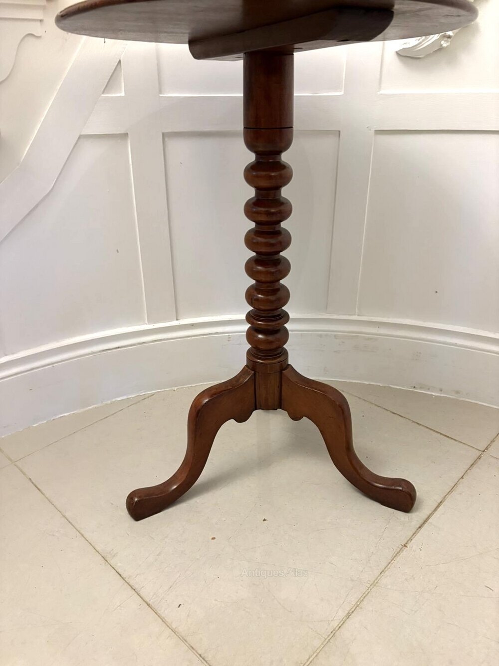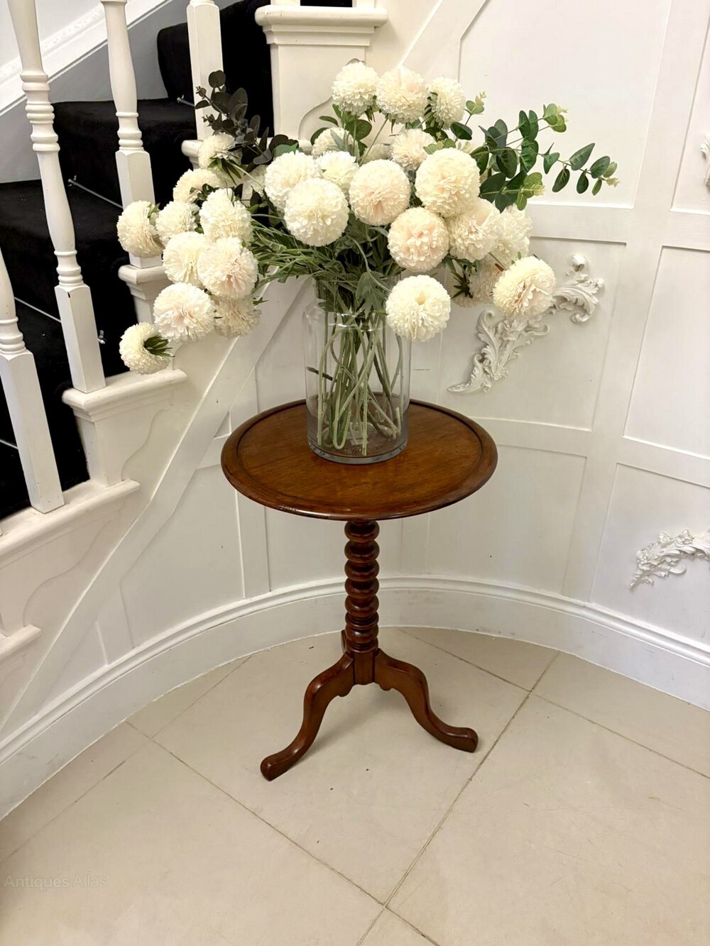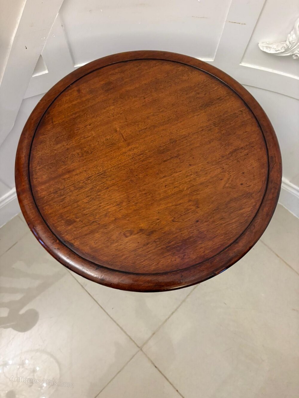 A fine mid-19th century Victorian mahogany wine / lamp table finely crafted and full of period charm. The circular top has a delicately moulded rim and rests upon a finely turned bobbin column supported by a tripod base with elegant swept cabriole legs ending in pad feet. Crafted from richly grained mahogany the table boasts a superb warm colour and patina developed over more than 160 years of careful use.Its graceful form and perfect proportions make it an ideal occasional lamp, or wine table — a versatile piece suited to both traditional and contemporary interiors. A wonderful example of mid-Victorian craftsmanship combining elegance, balance, and enduring quality.