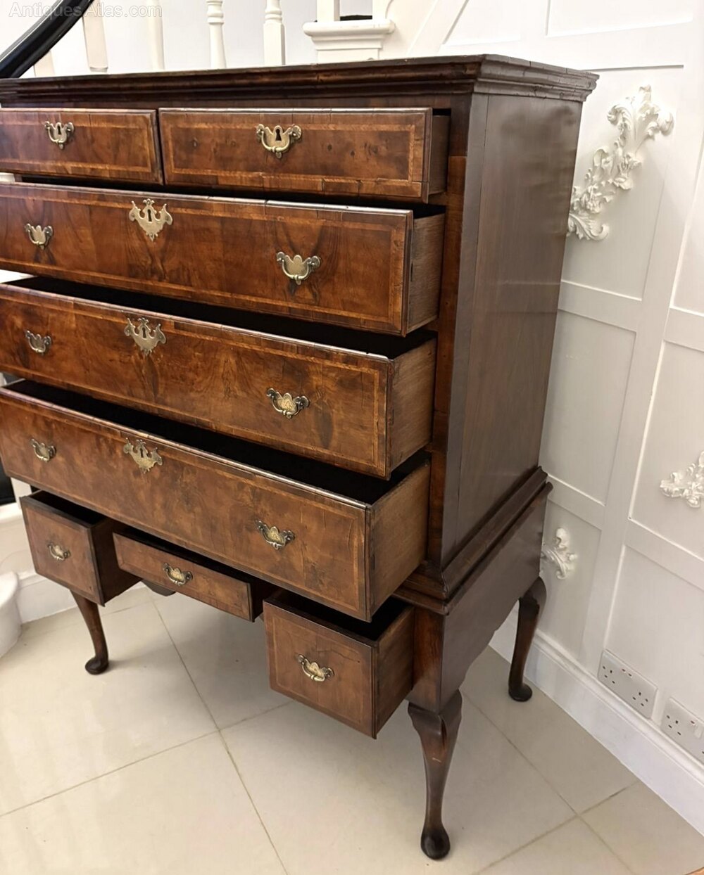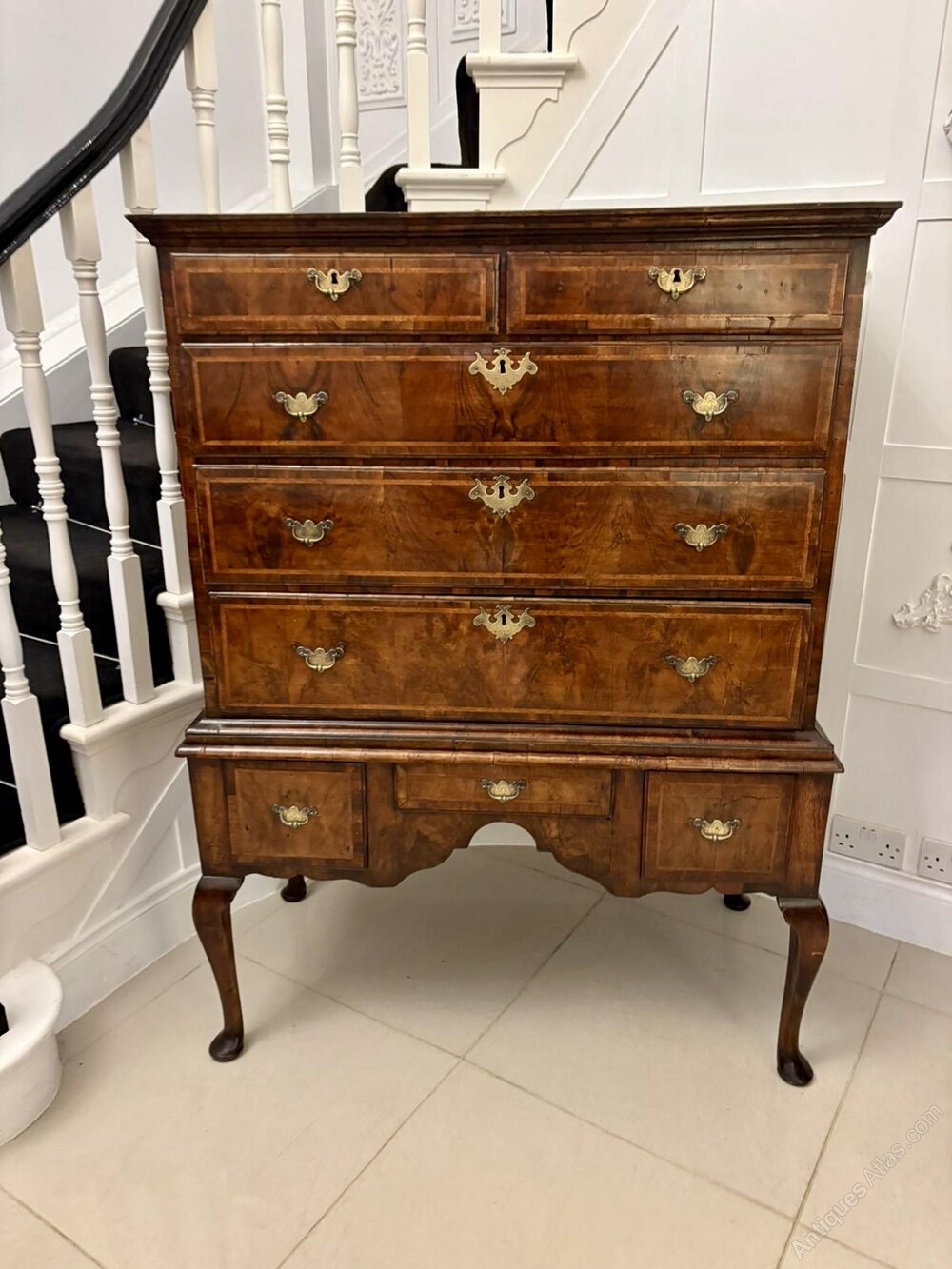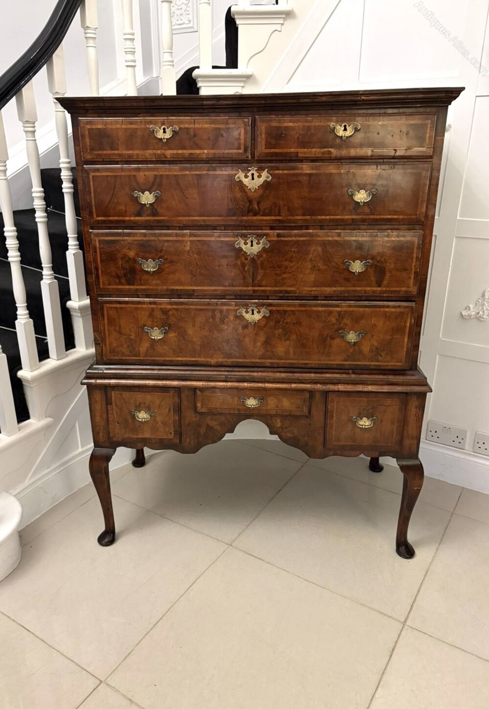 A magnificent early 18th-century antique George I walnut chest on stand superbly constructed and richly figured throughout. The upper section features two short over three long graduated drawers while the lower section is fitted with three further drawers, all retaining their original engraved brass handles and escutcheons.The beautifully quarter-veneered walnut surfaces are bordered with fine featherbanding displaying the deep, mellow patina that only centuries of age can produce. The piece stands elegantly on cabriole legs terminating in pad feet with a shaped apron adding to its refined silhouette.