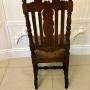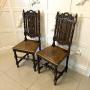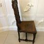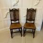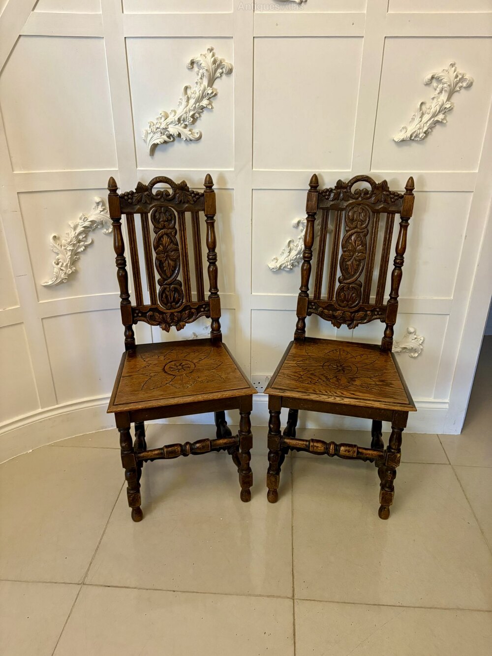A charming pair of late Victorian carved oak side chairs richly modelled with detailed foliate and fruit motifs. Each chair features a high decorative back with finely turned supports, a pierced top rail with vine and grape carving, and a solid oak seat intricately engraved with a central stylised floral design. Raised on robust turned legs united by shaped stretchers, these chairs are full of character and beautifully hand-crafted throughout.With strong colour, solid construction and excellent patina they make ideal hall, bedroom or occasional chairs and display superb craftsmanship typical of the period.