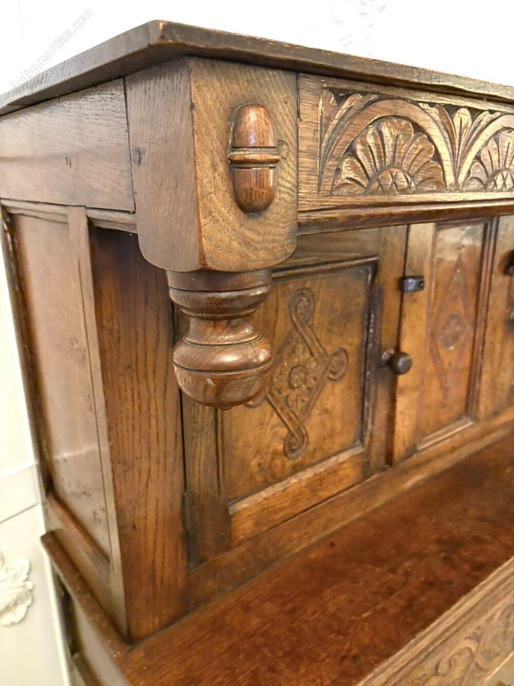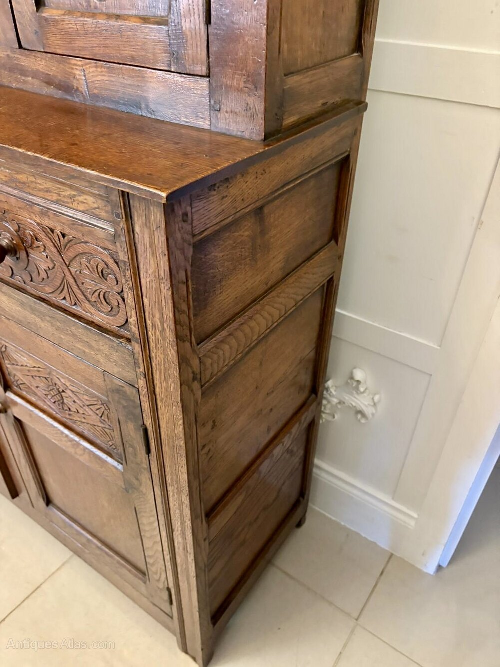 The warm patina and deeply carved decoration make this a striking example of the early 20th-century revival of English vernacular furniture. Perfect for a hallway, kitchen, dining room or as a statement storage piece in any interior.