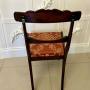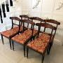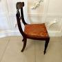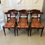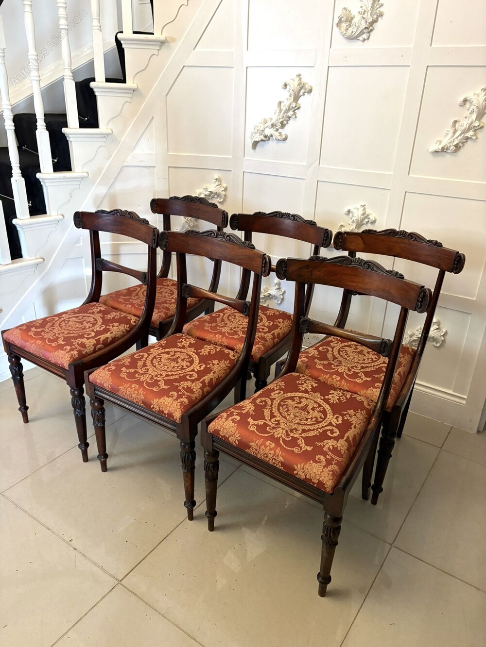 A fine set of six Regency rosewood dining chairs each displaying elegant flowing lines and refined carved detail. The shaped top rails feature scrolling carved embellishments leading into gently curved supports and a swept back splat with small shell-carved roundels at each end.The seats are upholstered in a rich damask fabric complementing the warmth of the rosewood frames. Each chair stands on turned and reeded front legs with carved capitals and elegantly swept rear legs giving the set a balanced and graceful Regency profile. Comfortable, well-made and beautifully proportioned they are ideal for both formal dining and everyday use.