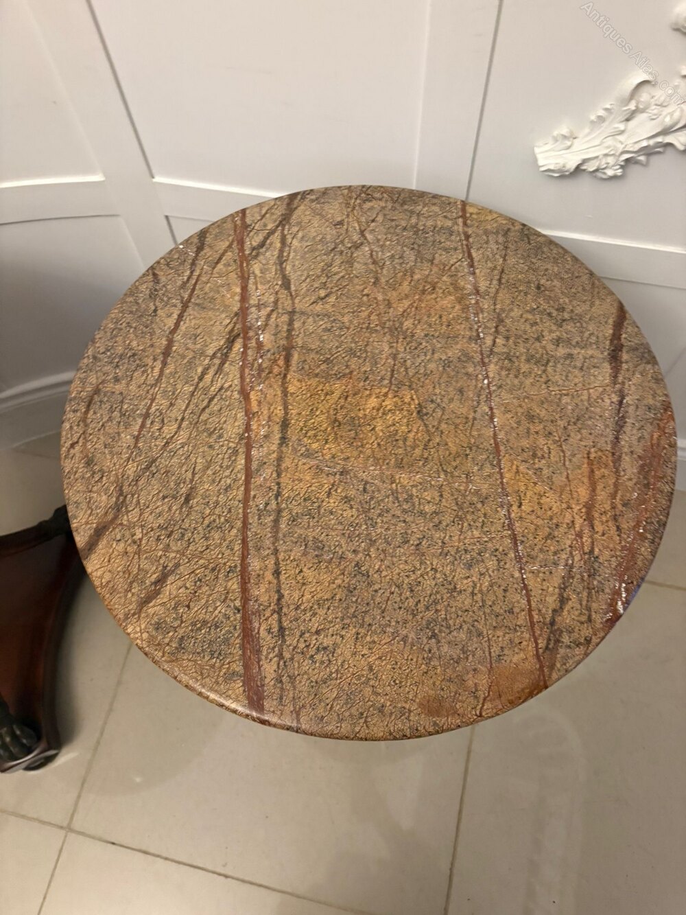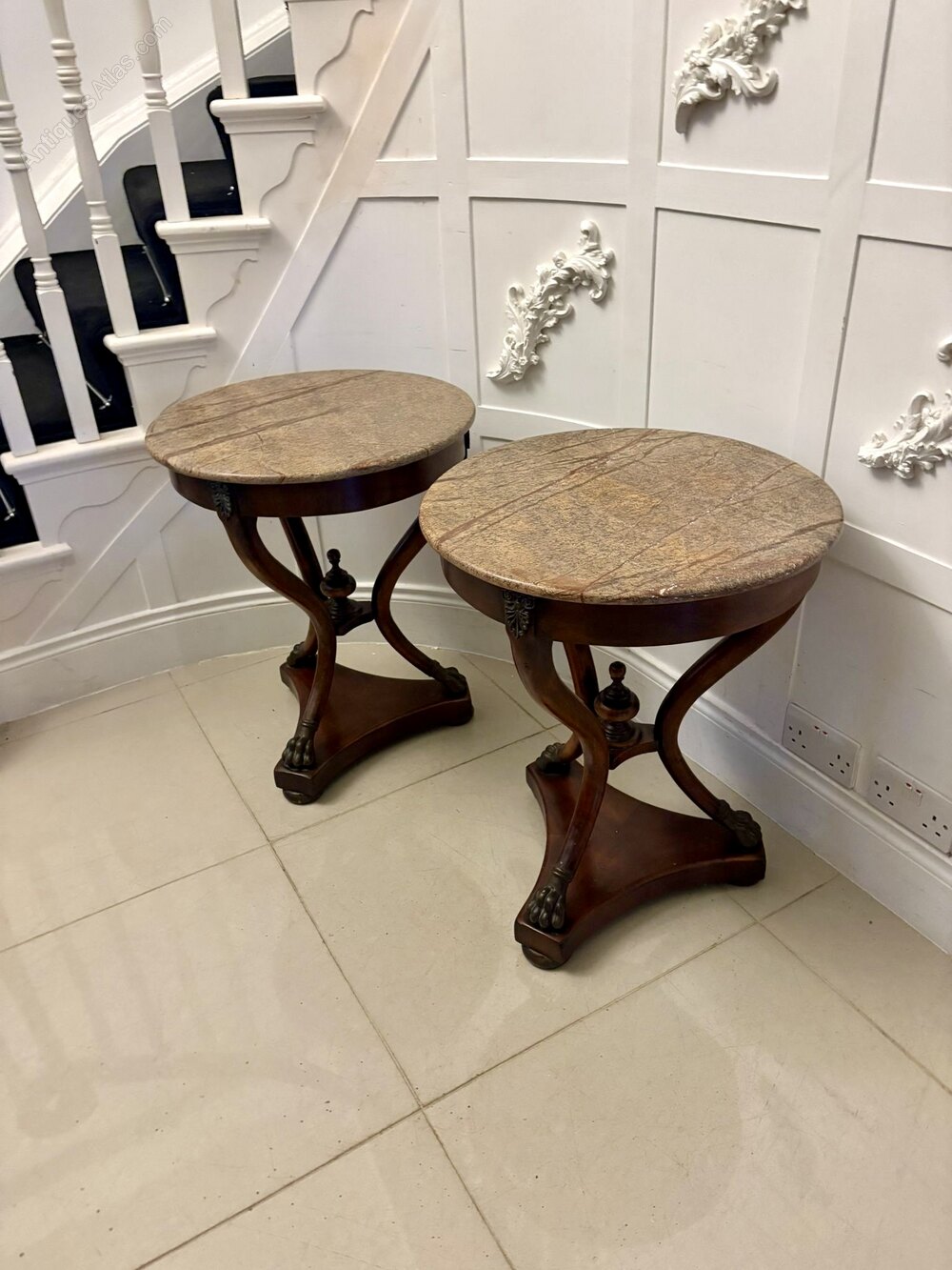 A superb pair of antique Edwardian French marble-top gueridon side / lamp tables of exceptional quality and elegance. Each table features a beautifully figured circular marble top with striking natural veining in warm earthy tones, adding wonderful depth and character.Supported on three gracefully shaped mahogany columns, the tables are united by a finely turned central finial. The bases are beautifully formed in a scrolling triangular shape and stand on bold bronze paw feet, giving the pair a strong classical presence.