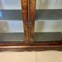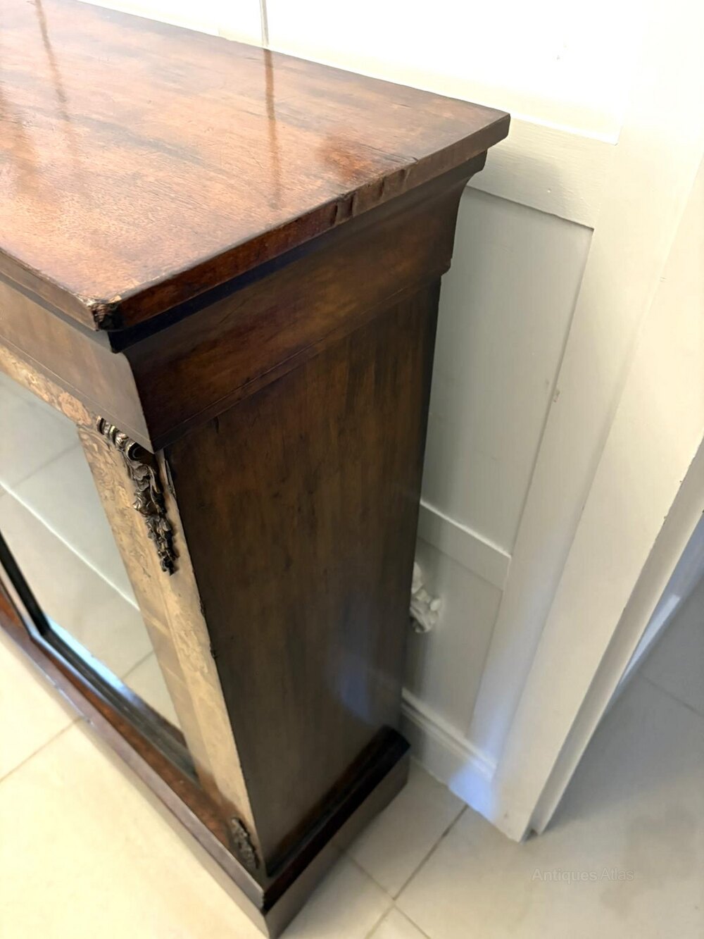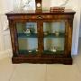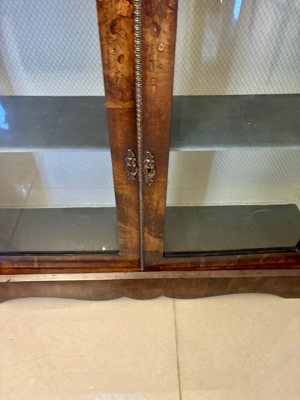 A fine quality Victorian figured burr walnut display cabinet richly adorned with exquisite floral marquetry inlay. The cabinet features beautifully figured burr walnut veneer with superb colour and depth enhanced by delicate marquetry panels to the frieze and the uprights, depicting scrolling foliage, blossoms and trailing stems.The twin glazed doors retain their original bevelled glass and open to reveal two internal shelves making it ideal for displaying silver, porcelain, or treasured collections. Decorative gilt-metal mounts and mouldings frame the doors and upright adding a refined, elegant contrast to the warm walnut tones.