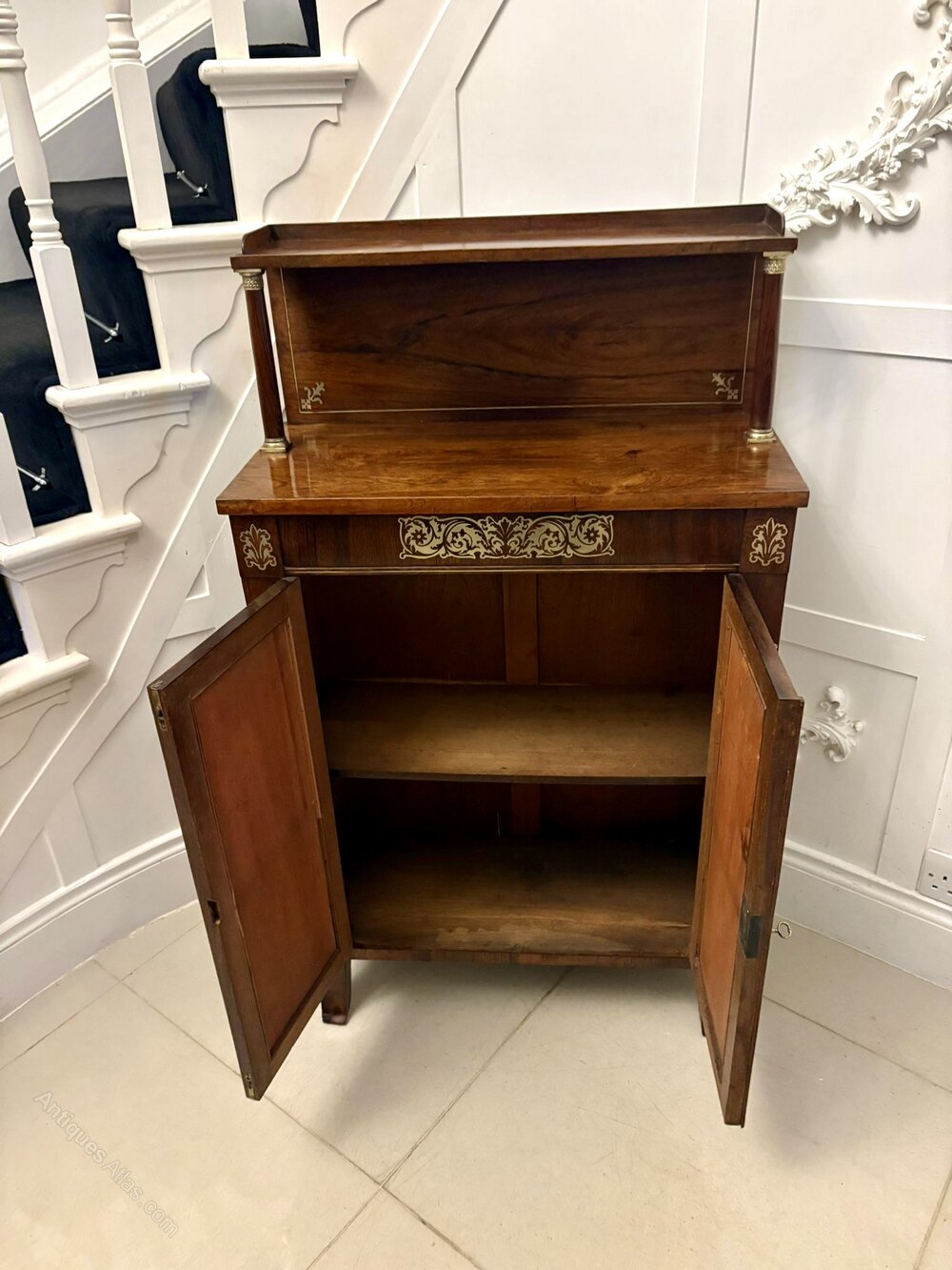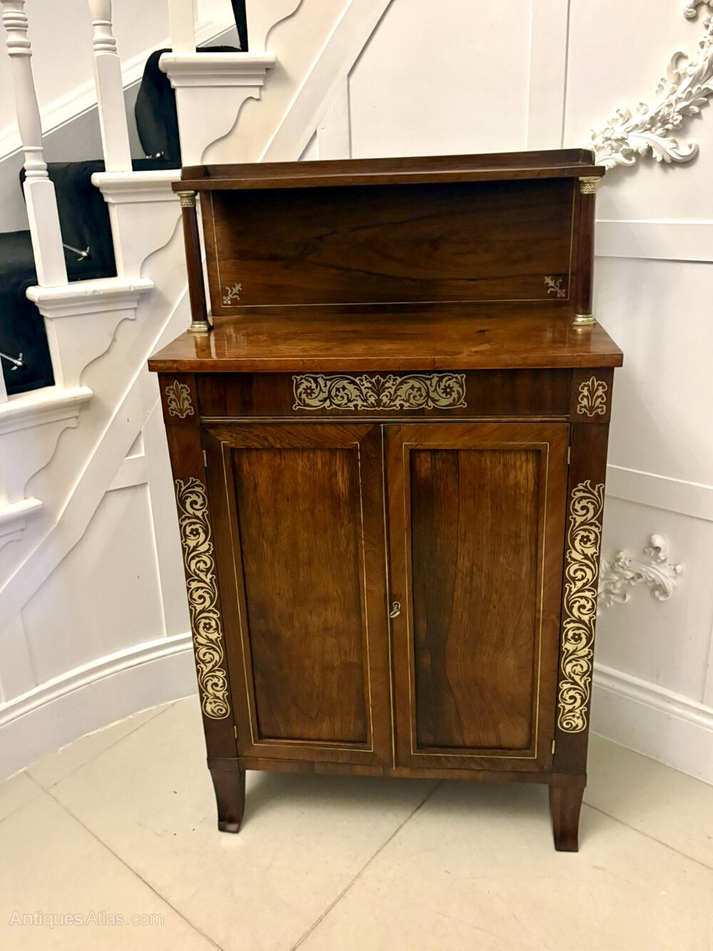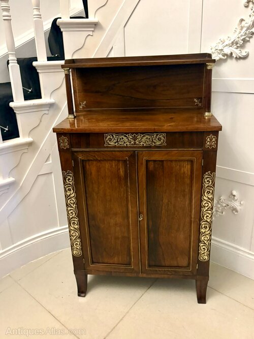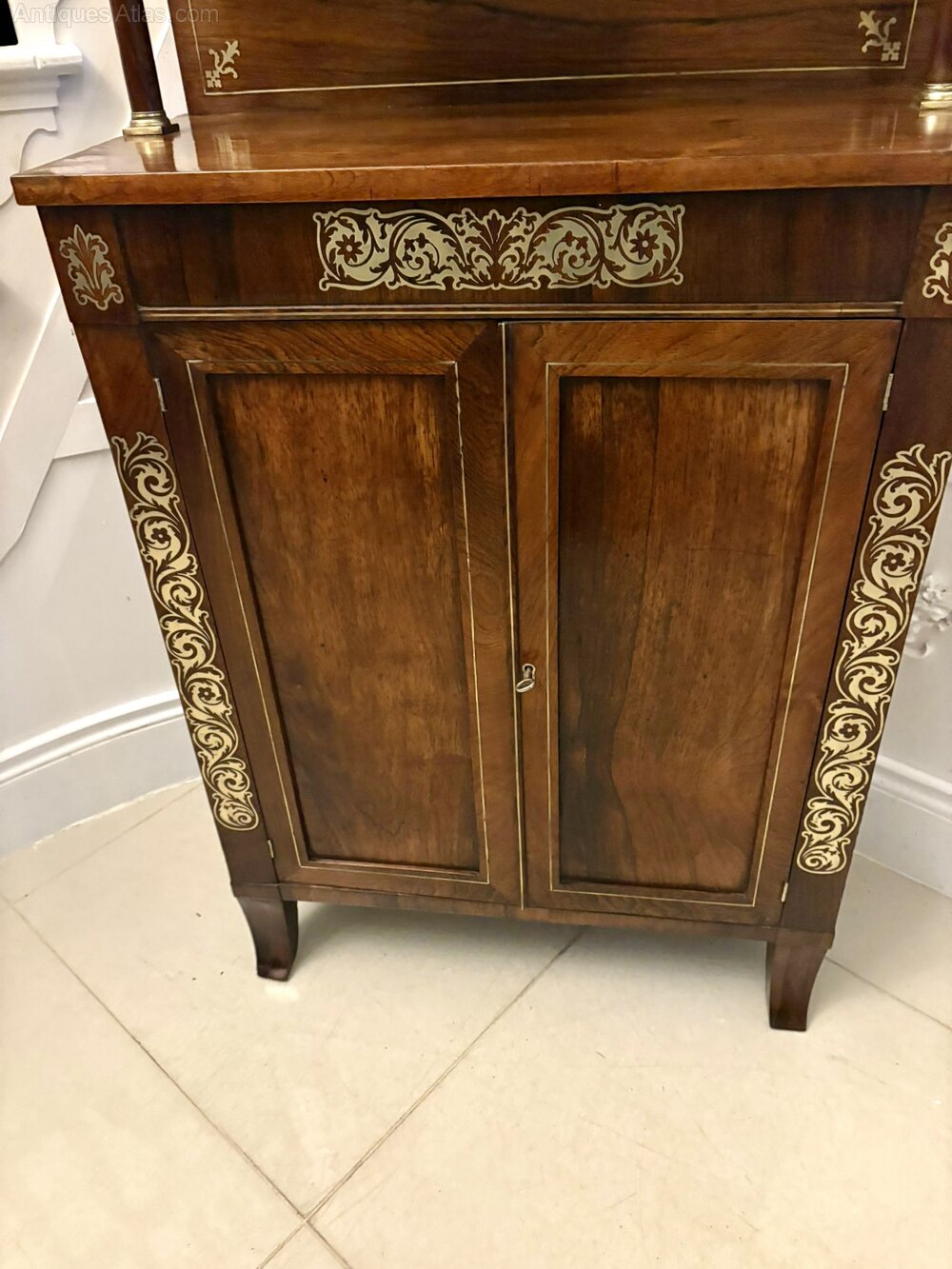 A superb early 19th-century Regency mahogany chiffonier of elegant form enriched with finely executed brass inlay and mounted columns. The piece displays the refined proportions and distinctive decorative language of the Regency period offering presence without heaviness.The chiffonier features a raised back with brass-mounted supports, a single frieze drawer with elaborate brass inlay, and a pair of panelled cupboard doors below each framed with further scrolling brass embellishment. Inside is a full-width shelf providing excellent storage. The mahogany is richly figured throughout with a warm even tone that contrasts beautifully with the inlaid brass.