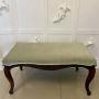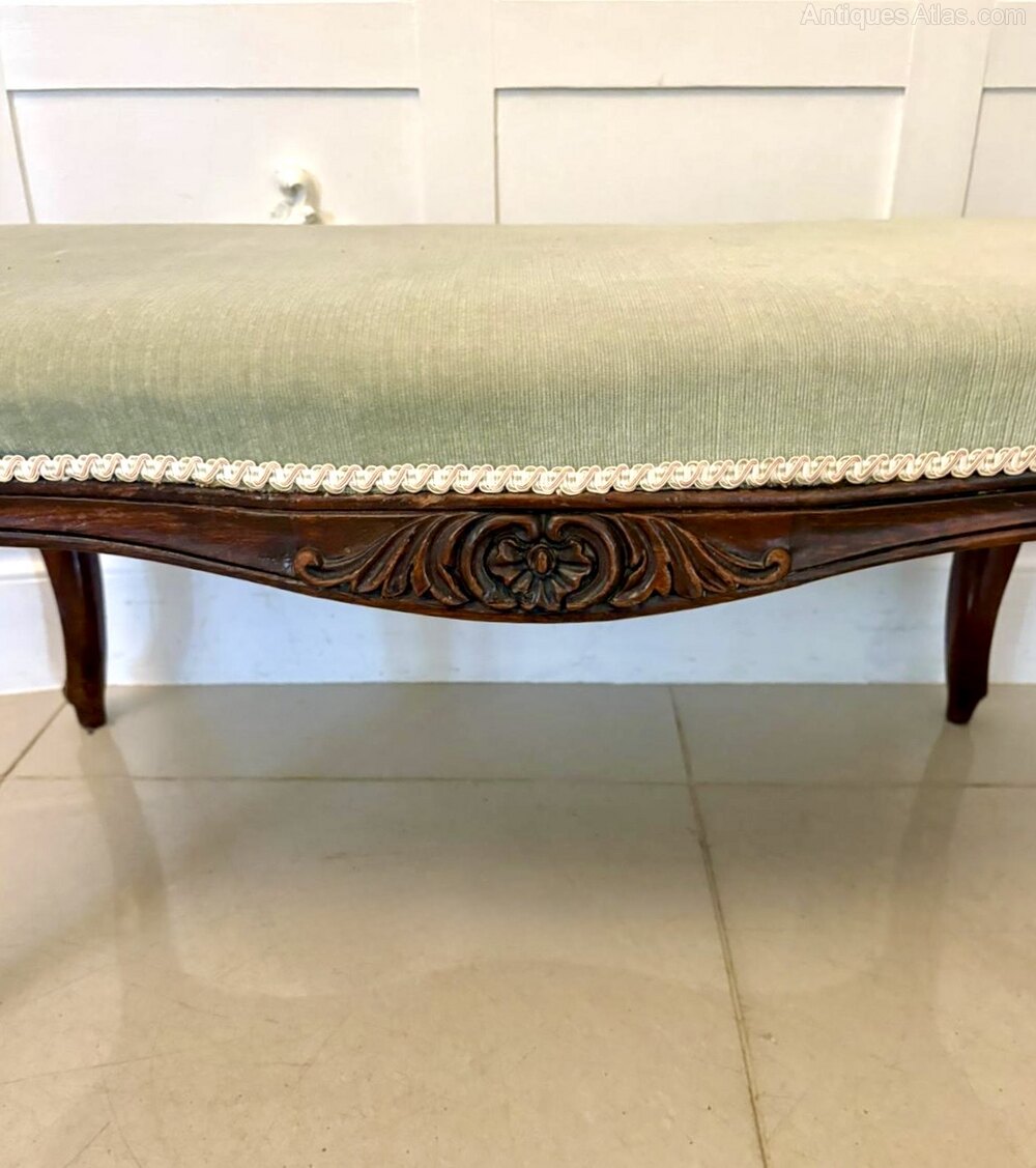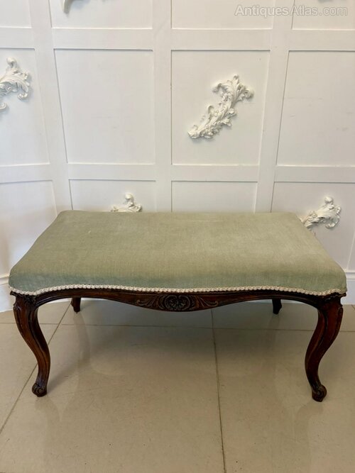 A beautifully proportioned and large example of a Victorian carved walnut stool. The walnut frame is finely shaped with carved floral motifs to the apron and elegant cabriole legs terminating in scrolled toes. The timber has developed a rich, warm patina, enhancing both the crispness of the carving and the graceful flowing outline.Upholstered in a soft sage-green fabric finished with decorative braid trim, the stool is both comfortable and highly decorative. Solid, well made and generous in scale, it offers excellent versatility for use in a bedroom, dressing area, hallway or drawing room.
