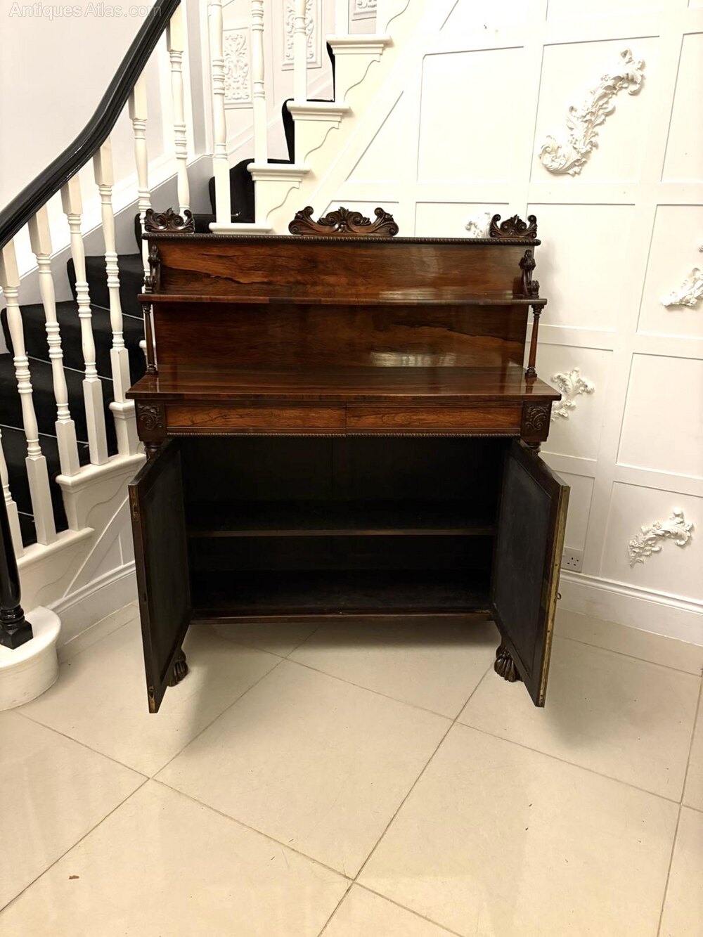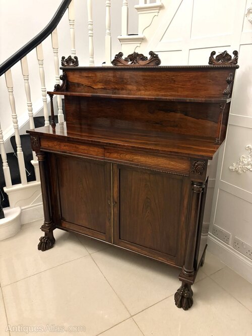 A fine quality antique Regency mahogany chiffonier / sideboard of superb craftsmanship and elegant proportion crafted from richly figured mahogany with a deep, lustrous patina, this piece exemplifies the refinement and symmetry characteristic of the late Georgian Regency period. The raised back features finely carved scroll and foliate decoration supported on turned columns above a generous serving surface. Below are two frieze drawers over a double cupboard enclosed by beautifully matched mahogany panels.The front is flanked by slender column supports and the sideboard stands proudly on bold carved lion’s paw feet, adding both balance and grandeur to the overall design. The clean classical lines, restrained ornamentation, and superior timber selection are all hallmarks of Regency furniture at its best.