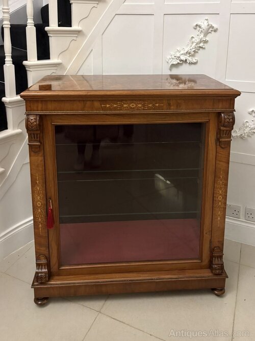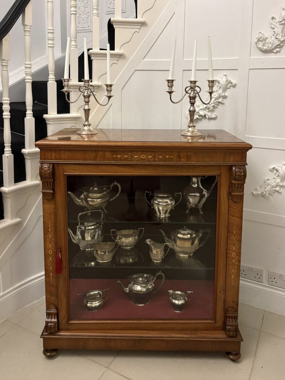 A handsome antique Victorian mahogany side / display cabinet distinguished by its fine inlay and elegant proportions.The well-figured top with moulded edge is crossbanded and finished with satinwood stringing echoing the line-inlaid frieze below. Twin panelled cupboard doors are framed with contrasting boxwood/satinwood stringing and inlaid corner spandrels opening to a practical storage interior. Slender inlaid pilasters flank the doors, and the whole stands on a tidy plinth base, the enriched inlay providing a refined contrast to the warm mahogany.