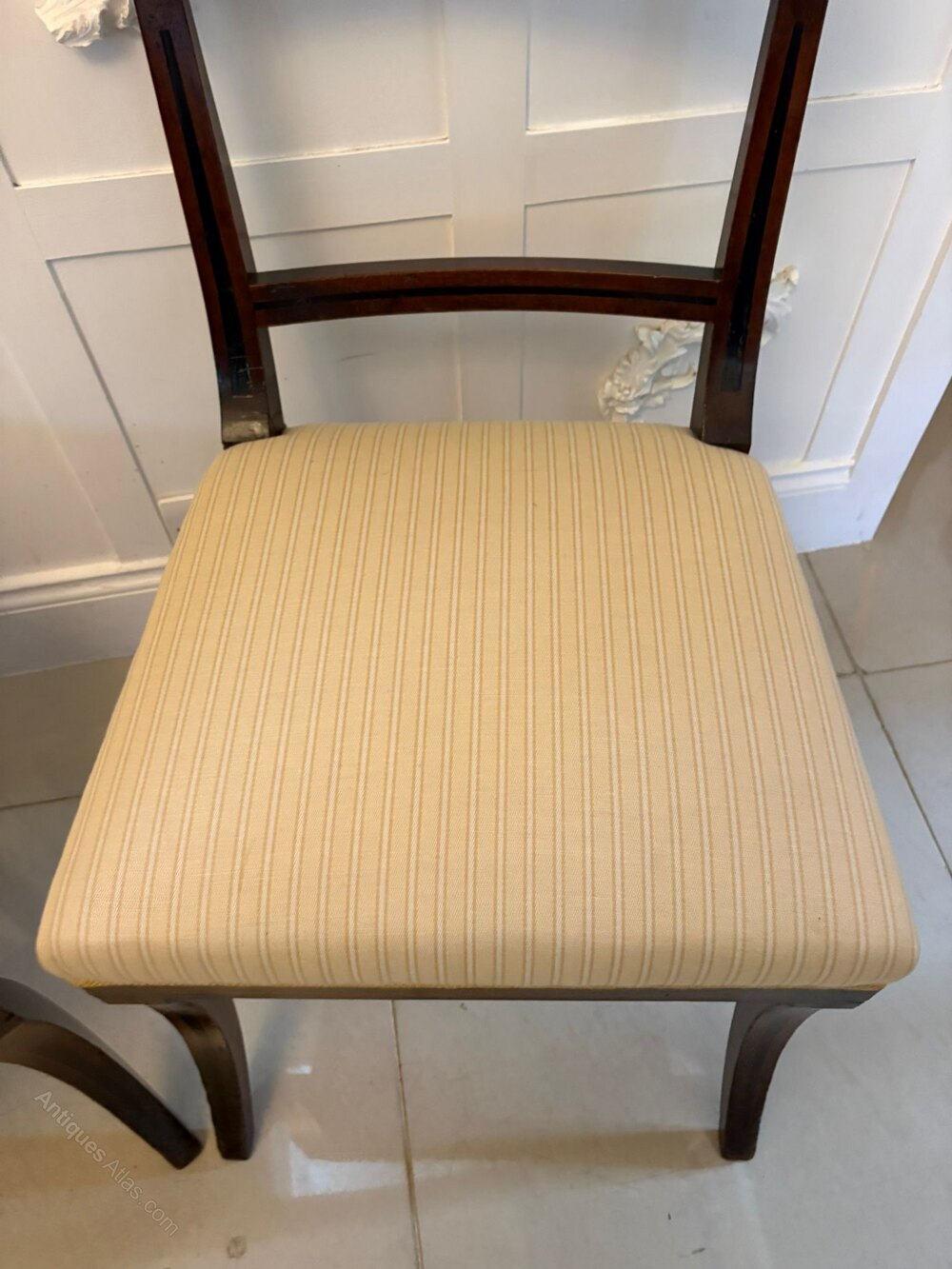 A particularly stylish and decorative pair of Regency mahogany chairs displaying elegant classical lines and attractive inlaid detail.
