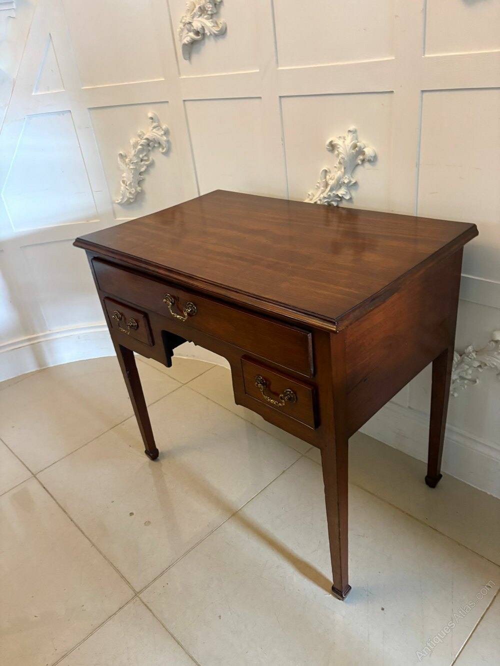A superb antique Georgian mahogany lowboy of elegant proportions, raised on square tapering legs with refined, understated lines typical of the period.The top displays a rich, warm colour with attractive figuring to the mahogany. The front is fitted with a long central drawer flanked by two smaller drawers, all retaining their original brass handles and escutcheon. The drawers are well constructed with hand cut dovetail joints, a clear sign of traditional craftsmanship.