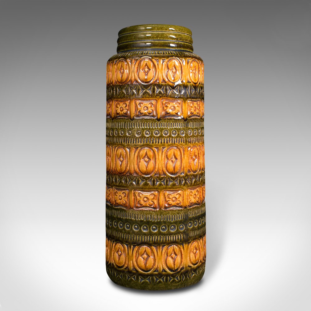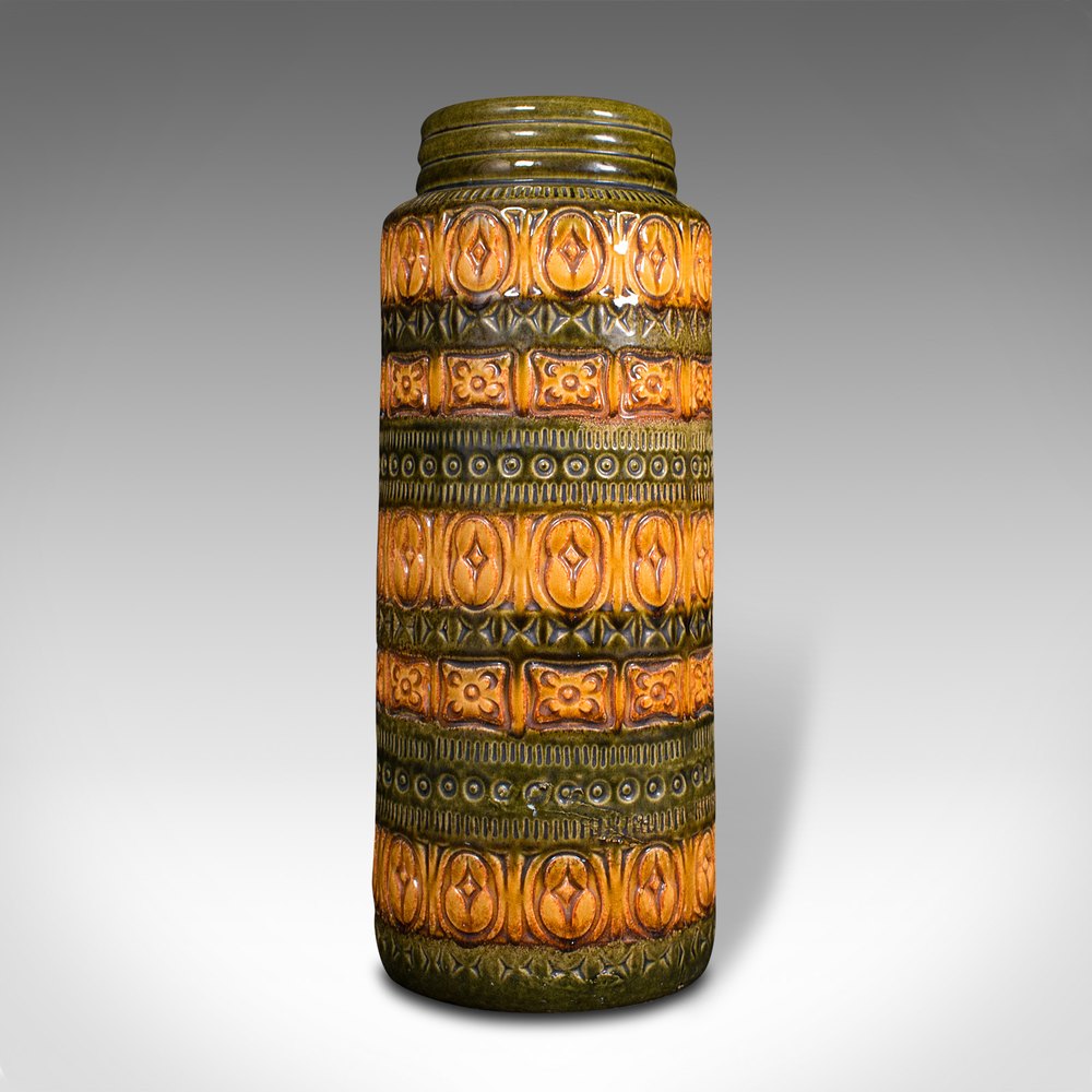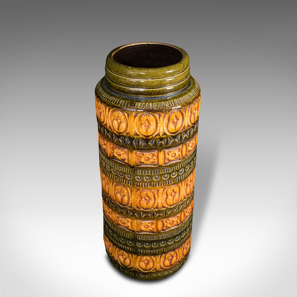 This is a vintage flower vase. A German, ceramic lava slip or decorative hall stick stand, dating to the mid 20th century, circa 1970.Striking period colour and decoration