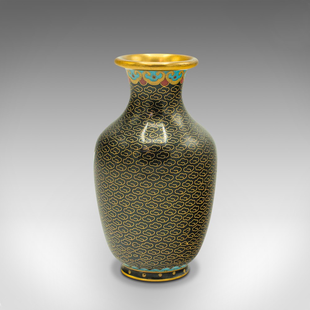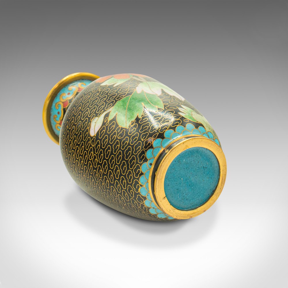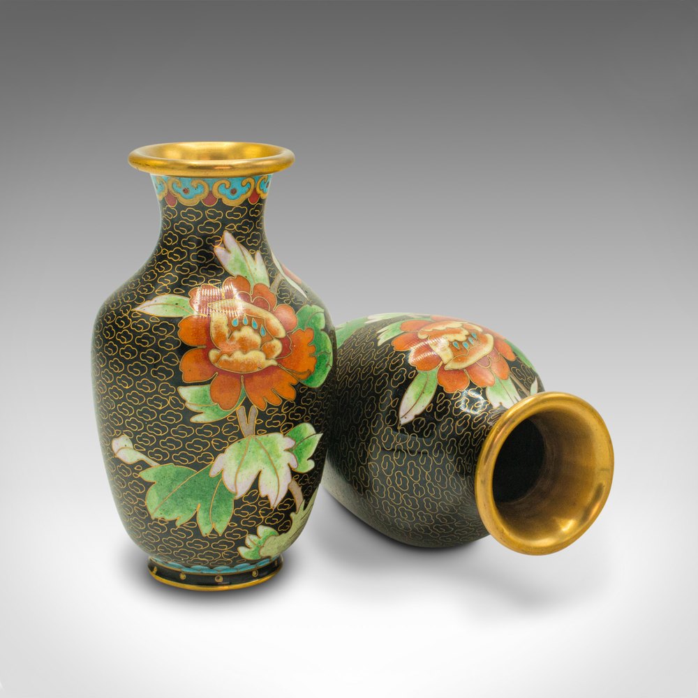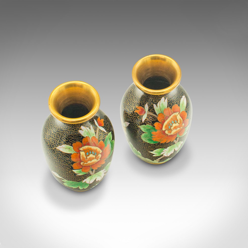 This is a pair of small vintage cloisonné posy vases. A Japanese, ceramic flower urn, dating to the late Art Deco period, circa 1950.Delightfully diminutive, with an attractive finish