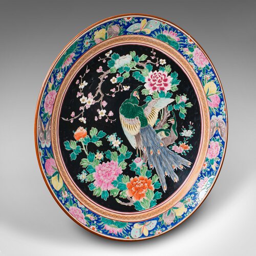 This is a large vintage decorative charger. A Japanese, ceramic serving or mounted plate, dating to the late Art Deco period, circa 1940.Bountiful colour accentuating this generously sized plate