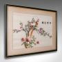 Presents two birds within a flowering tree and calligraphy to the upper corner