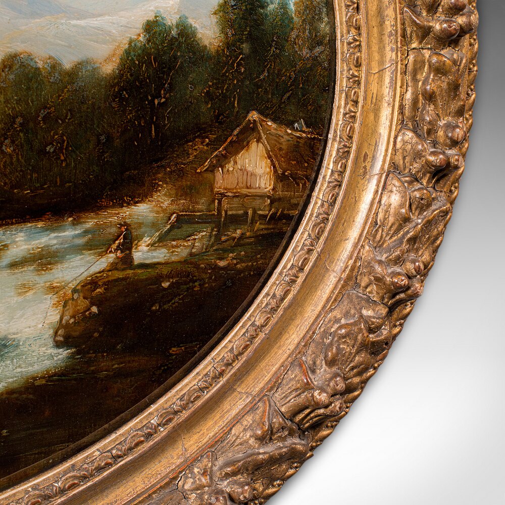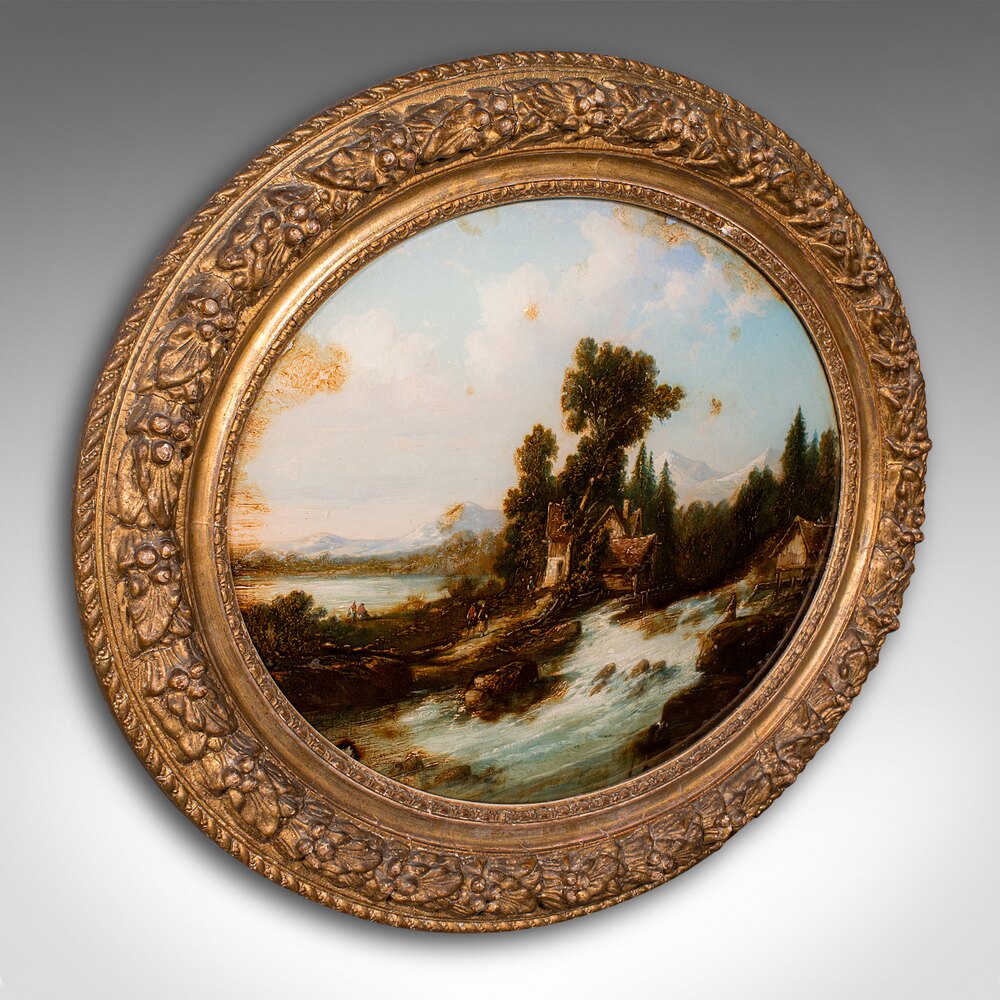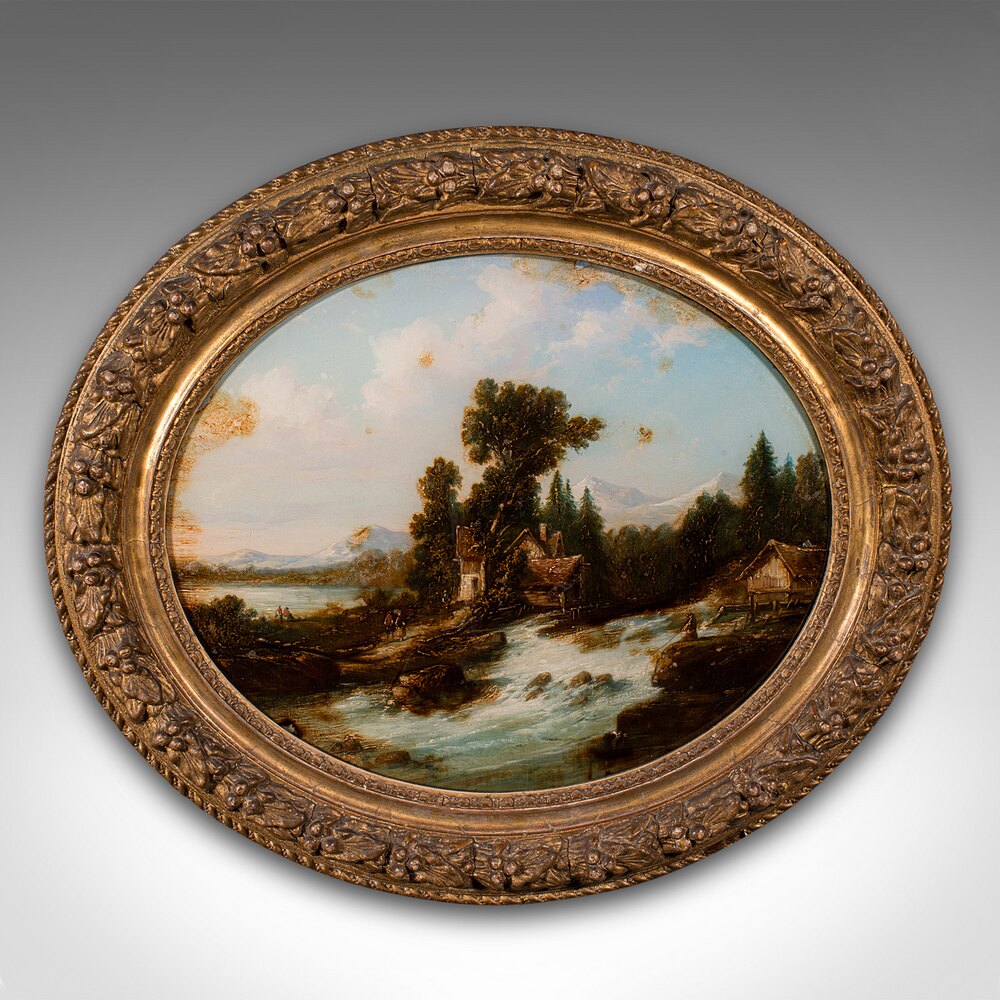 Our Stock # 25302This is a charming Victorian period reverse painted landscape, offering a brooding aesthetic and period art appeal, dating to circa 1860. This antique oval convex painting is set within an ornate giltwood frame.