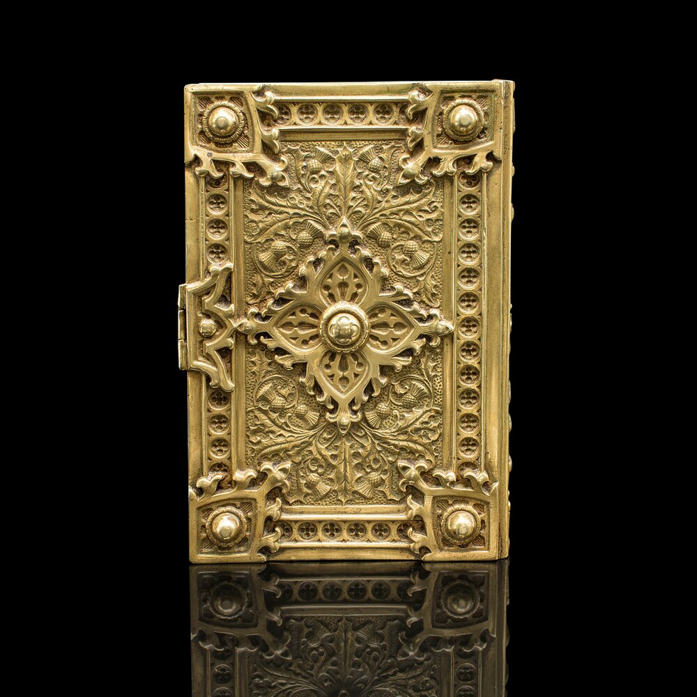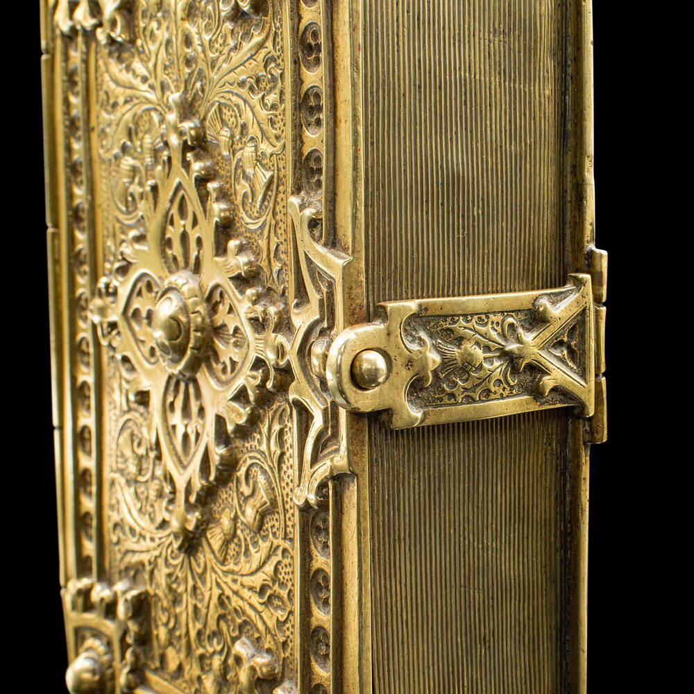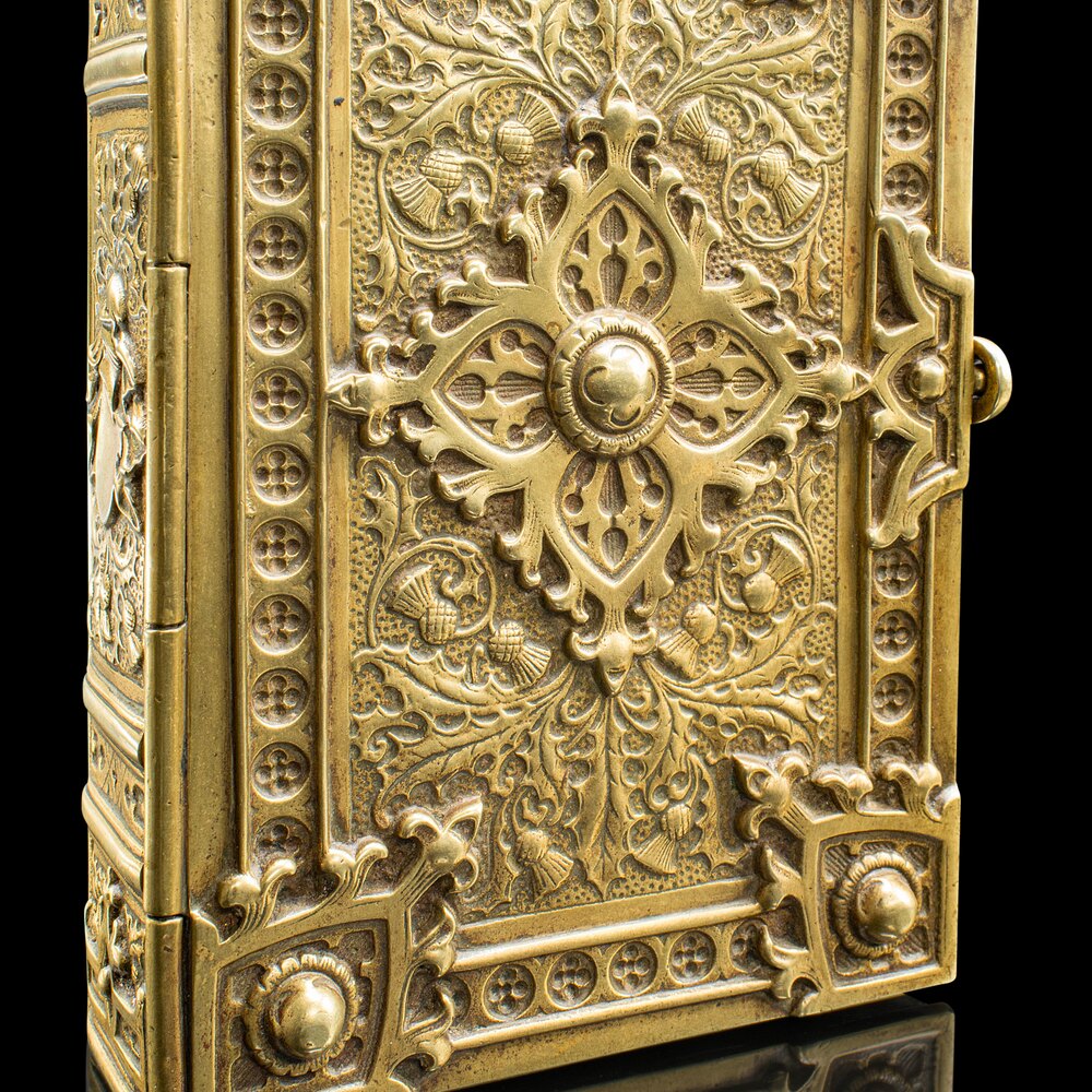Our Stock # 25636This is a fine antique personal diary repository, originating from Scotland during the Victorian period, circa 1870. This striking book form keepsake case showcases the craftsmanship and decorative style of 19th century Scotland, offering an elegant and secure way to store treasured personal items or books. Crafted from quality brass with rich golden tones and a profusely decorative Gothic design, this piece makes a captivating display item as well as a functional keepsake holder.
