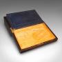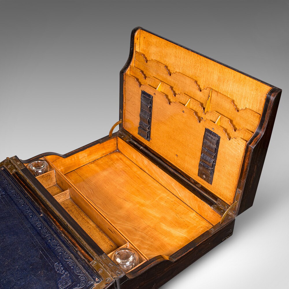 Lid opens to reveal dual writing skivers, in a later dark blue embossed leather