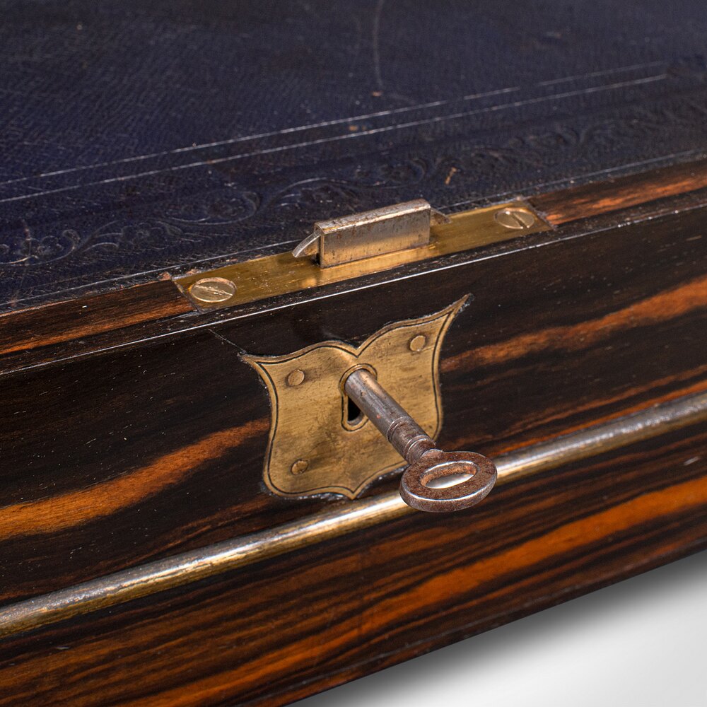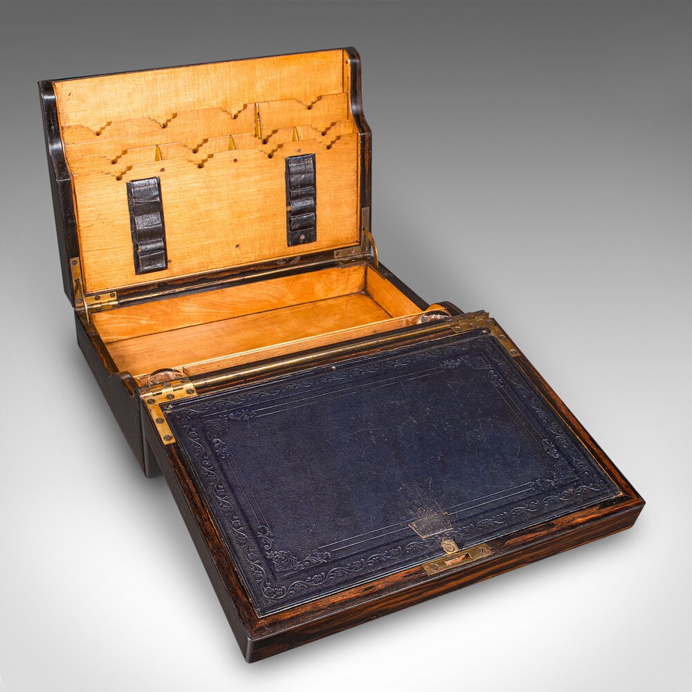 Our Stock # 25514This is an antique bachelor’s writing slope. An English, coromandel and satinwood correspondence box dating to the Regency period, circa 1830. A superior example of portable desk furniture, showcasing striking casework and a fine fitted interior.
