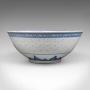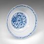 Our Stock # 25262This is a vintage display bowl. An Oriental, ceramic decorative serving dish, dating to the Art Deco period, circa 1930. A charming example of early 20th century craftsmanship, showcasing traditional blue on white artistry and refined translucence.