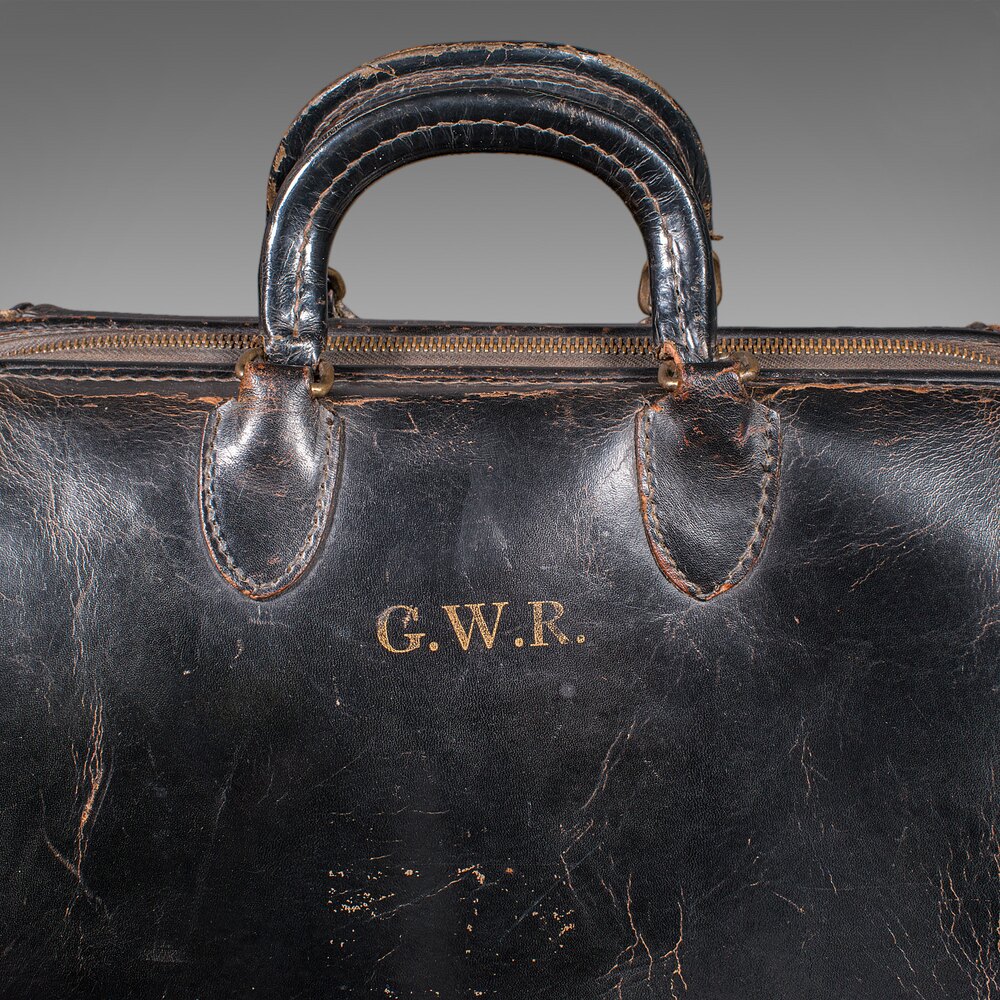 This is a fascinating antique Gladstone bag, the GWR monogram suggesting it was used for carrying a railway hat and associated whistles. In appealing, gently aged order, thisbag would be ideally suited for a revival festival or for collectors of railway interest. Delivered ready to enjoy.