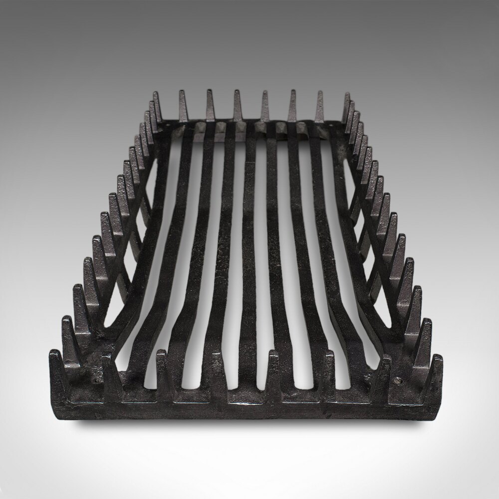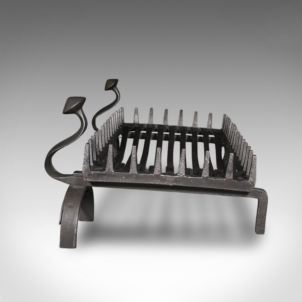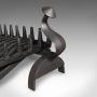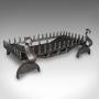 Our Stock # 25519This is a large antique fireplace set. An English, cast iron fire basket and andirons suite with gothic revival taste, dating to the Edwardian period, circa 1910.