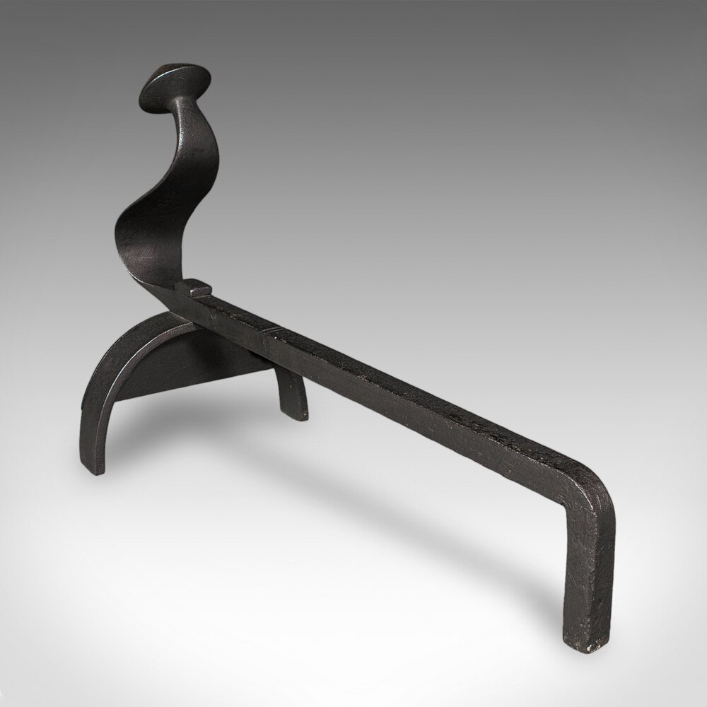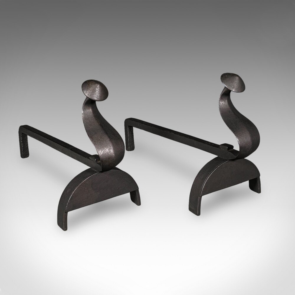 Striking swan neck andirons with a serpentine form and distinctive demi-lune front legs