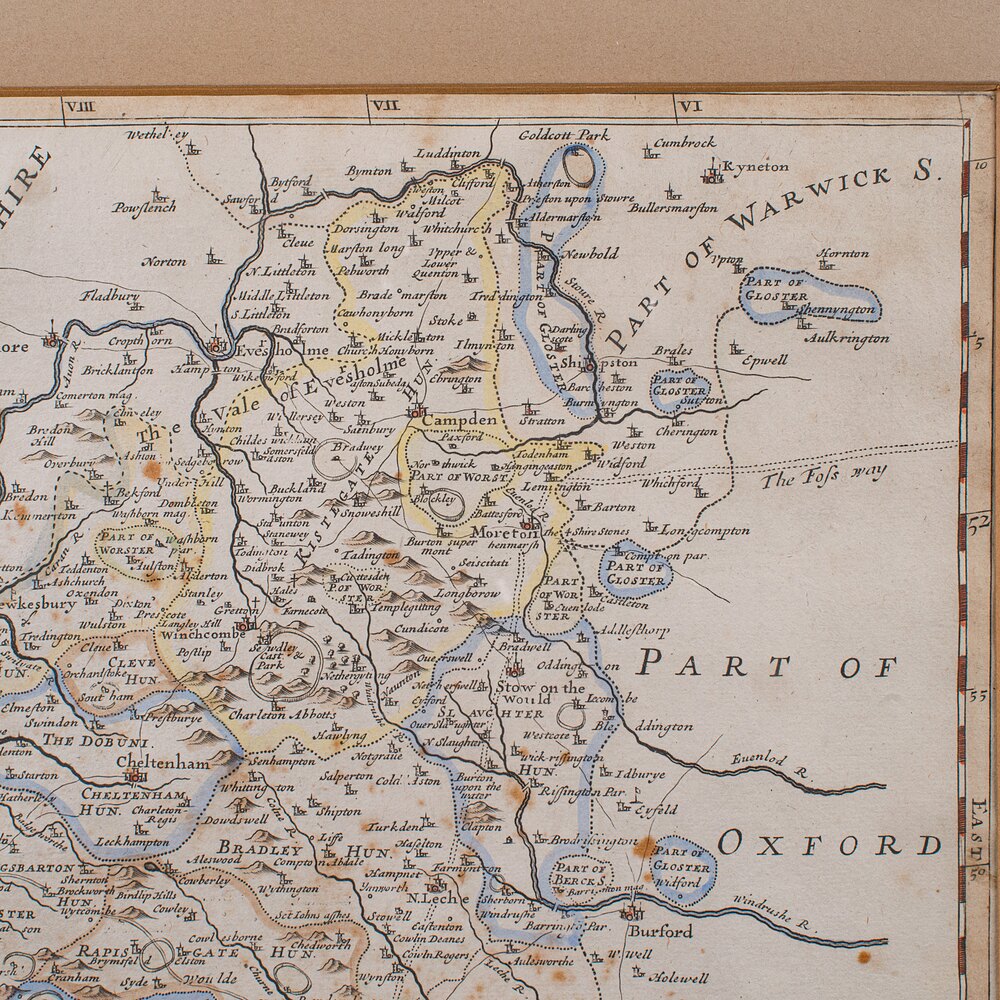 Our Stock # 25924This is an antique framed map of Gloucestershire. An English, atlas engraving of cartographic interest By Robert Morden, dating to the late 17th century and later.