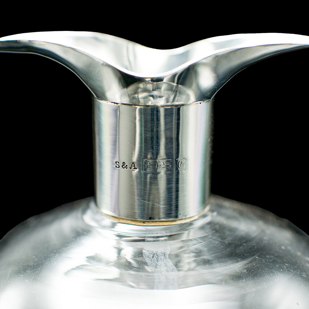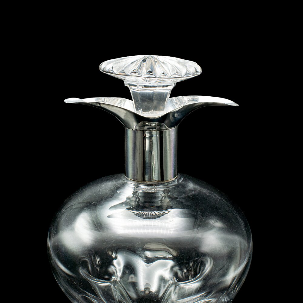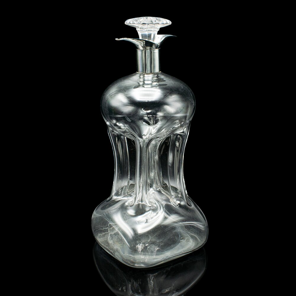 Our Stock # 25971This is an antique spirit decanter. An English, glass and silver Port or Brandy bottle, dating to the early Edwardian period, hallmarked in 1902. Combining a distinctive glass form with a quality silver collar, it exemplifies the understated refinement of early 20th-century tableware.