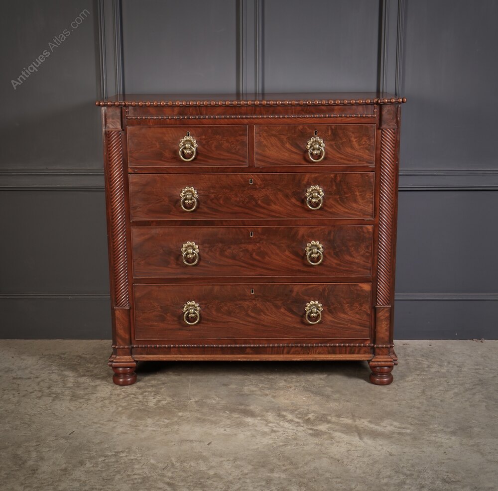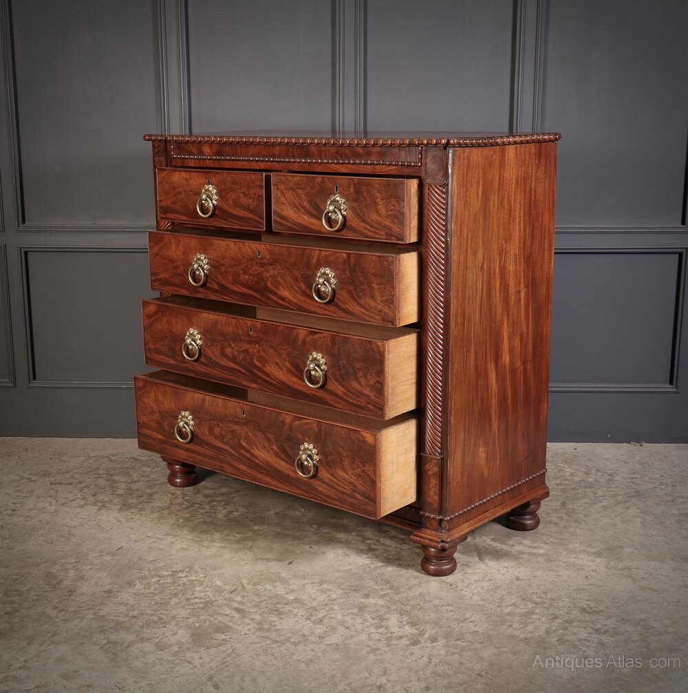 A superb quality 19th century Scottish chest of drawers in striking flame mahogany.This elegant piece features a traditional arrangement of two short over three long cockbeaded drawers, all retaining their lovely original brass handles and locks. The rich mahogany has a deep, glowing patina with beautiful figuring throughout.