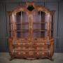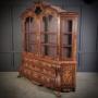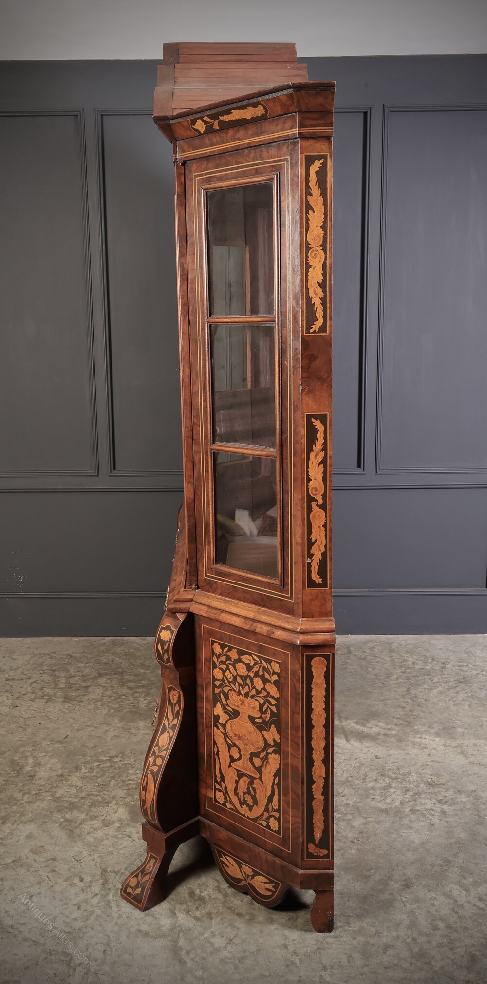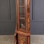 A striking walnut glazed cabinet of impressive scale, beautifully decorated with fine marquetry inlay and an elegant bombe-shaped base.This two-piece cabinet features a shaped top section with twin glazed doors, opening with the original working lock and key, and glazed side panels allowing light to flow through. Inside are two fitted shelves, perfect for displaying glassware, porcelain, or treasured collections.
