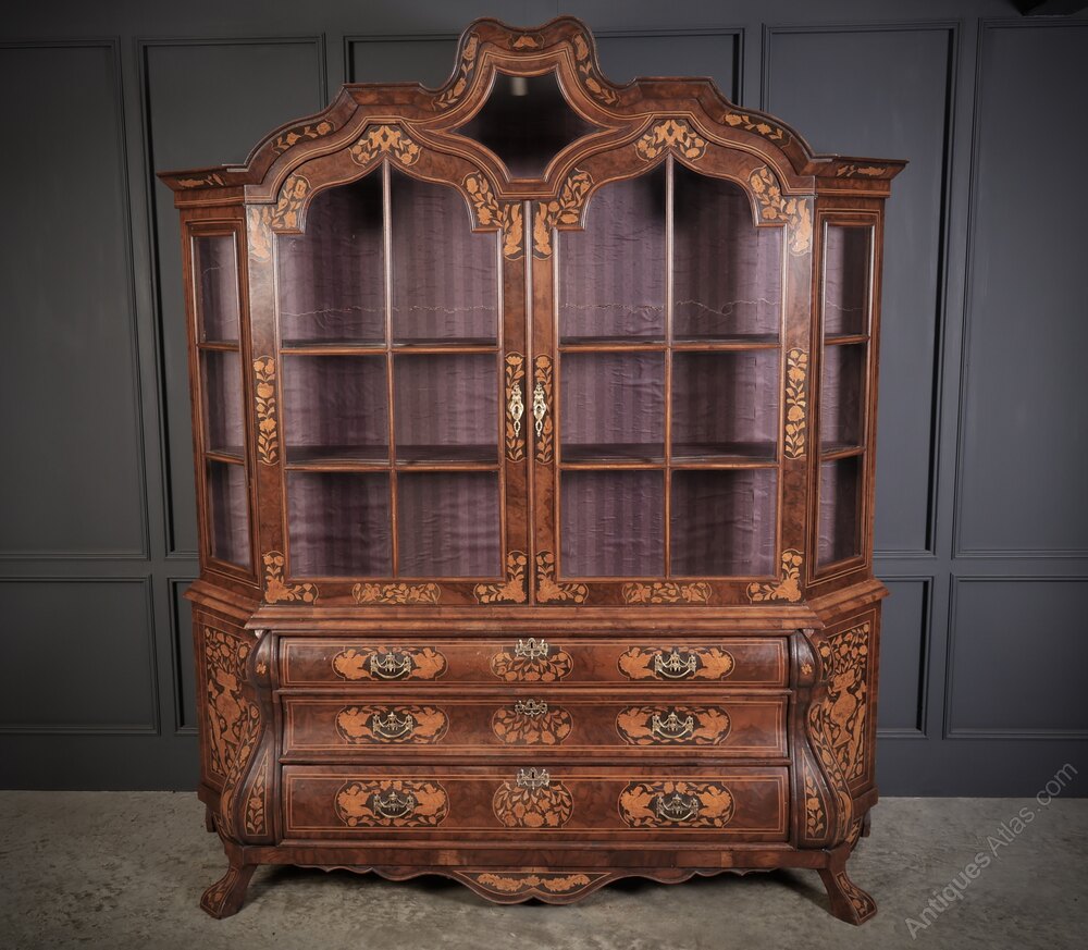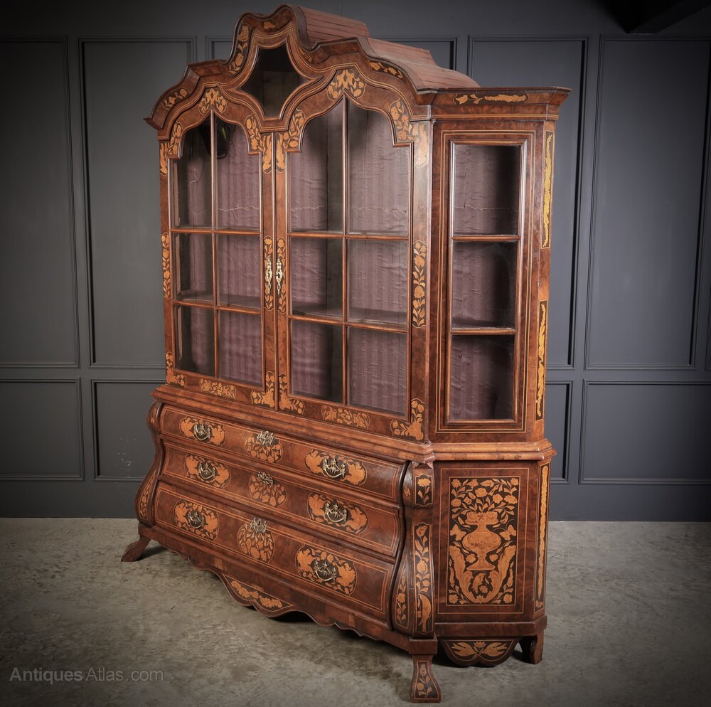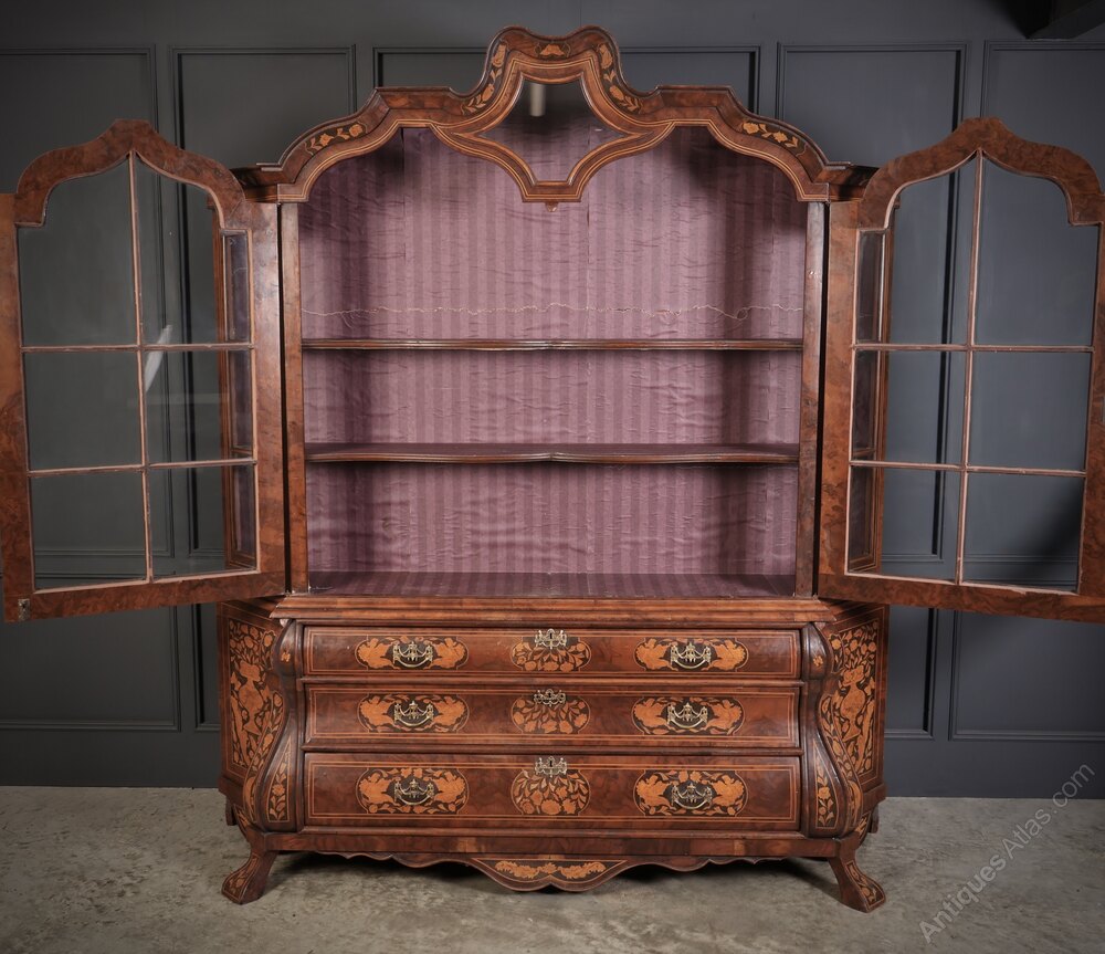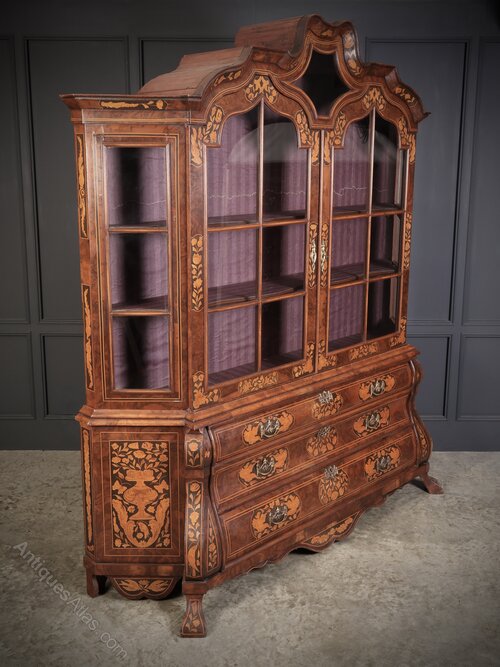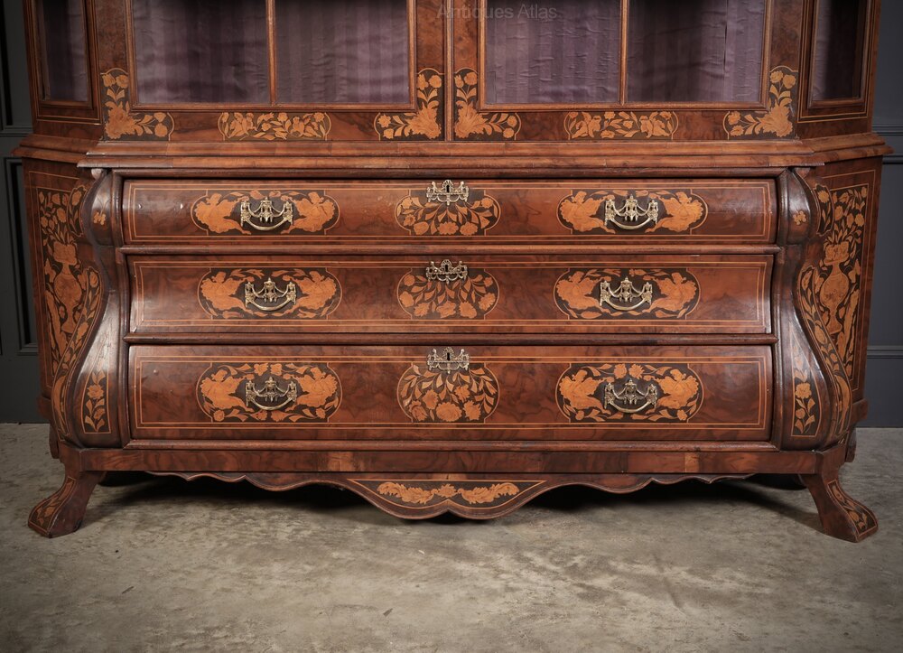 Large Marquetry Inlaid Walnut Bombe Shaped Cabinet